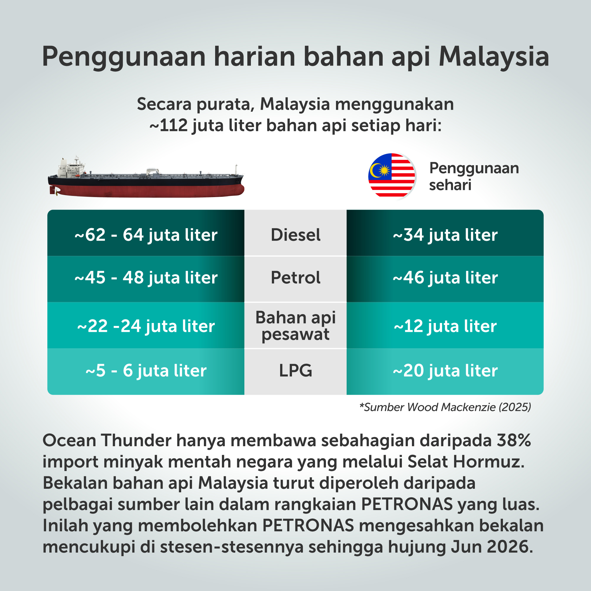 Berdasarkan data Wood Mackenzie (2025), Malaysia menggunakan purata kira-kira 112 juta liter bahan api sehari, terdiri daripada sekitar 34 juta liter diesel, 46 juta liter petrol, 12 juta liter bahan api penerbangan dan 20 juta liter LPG.