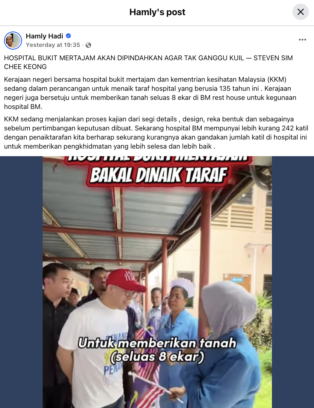 Ahli lembaga berkenaan menjelaskan lawatan Menteri Pembangunan Usahawan dan Koperasi, Steven Sim Chee Keong, ke hospital pada 14 September 2025 tidak pernah membincangkan isu kuil, sebaliknya menumpukan kepada usaha penambahbaikan fasiliti demi kesejahteraan rakyat.
