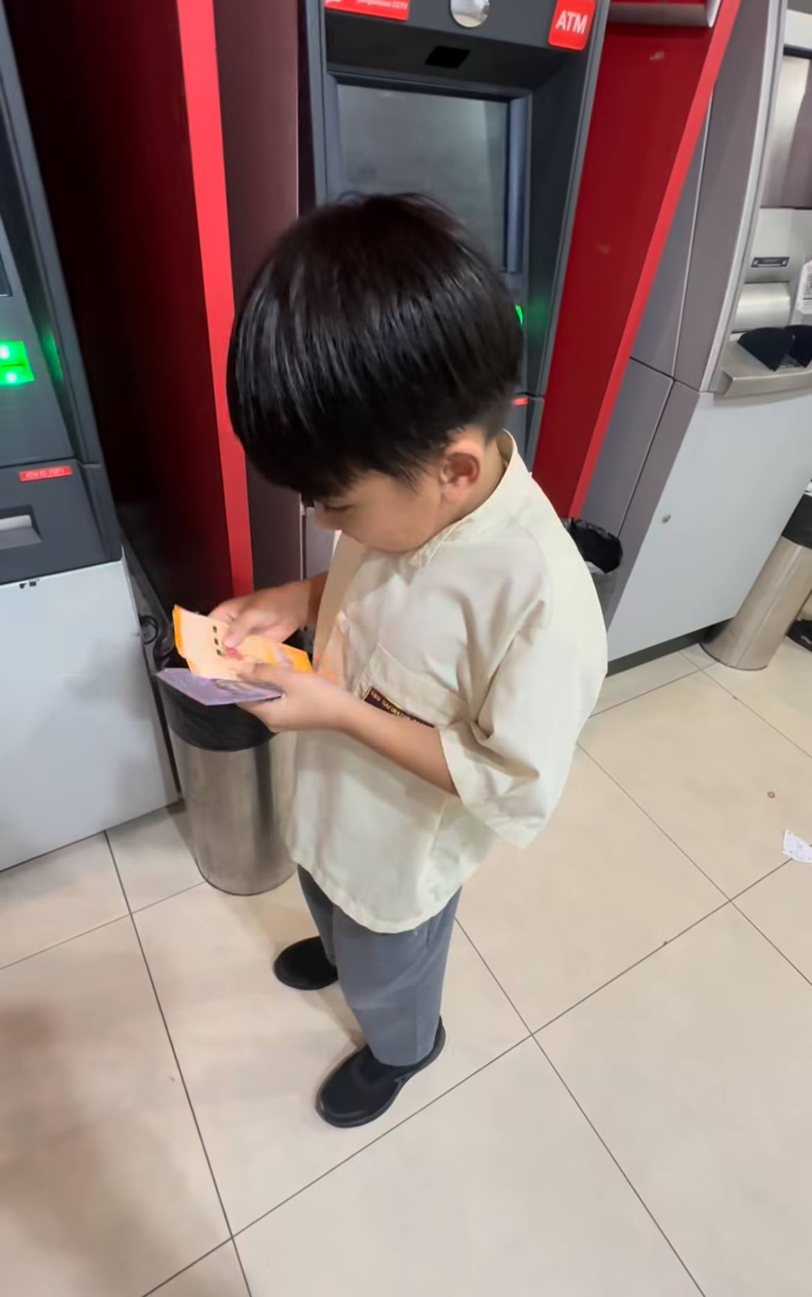 Sementara itu, dalam perkongsian berasingan memaparkan Fazren dan anaknkya mencari mesin juruwang automatik (ATM) dan mengeluarkan wang tunai seperti yang telah dinjanjikan sebelum diberikan kepada anak lelakinya.