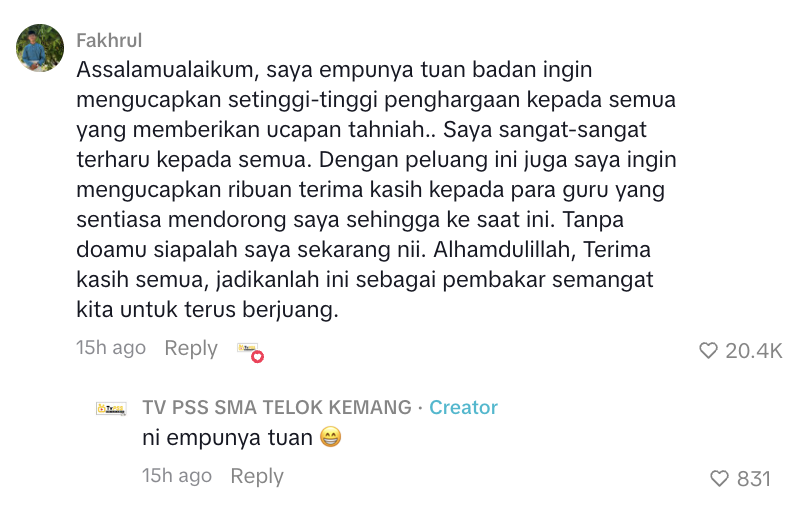 Dalam pada itu, Fakhrul Iman juga telah mengucapkan terima kasih kepada semua yang menzahirkan ucapan tahniah kepadanya.