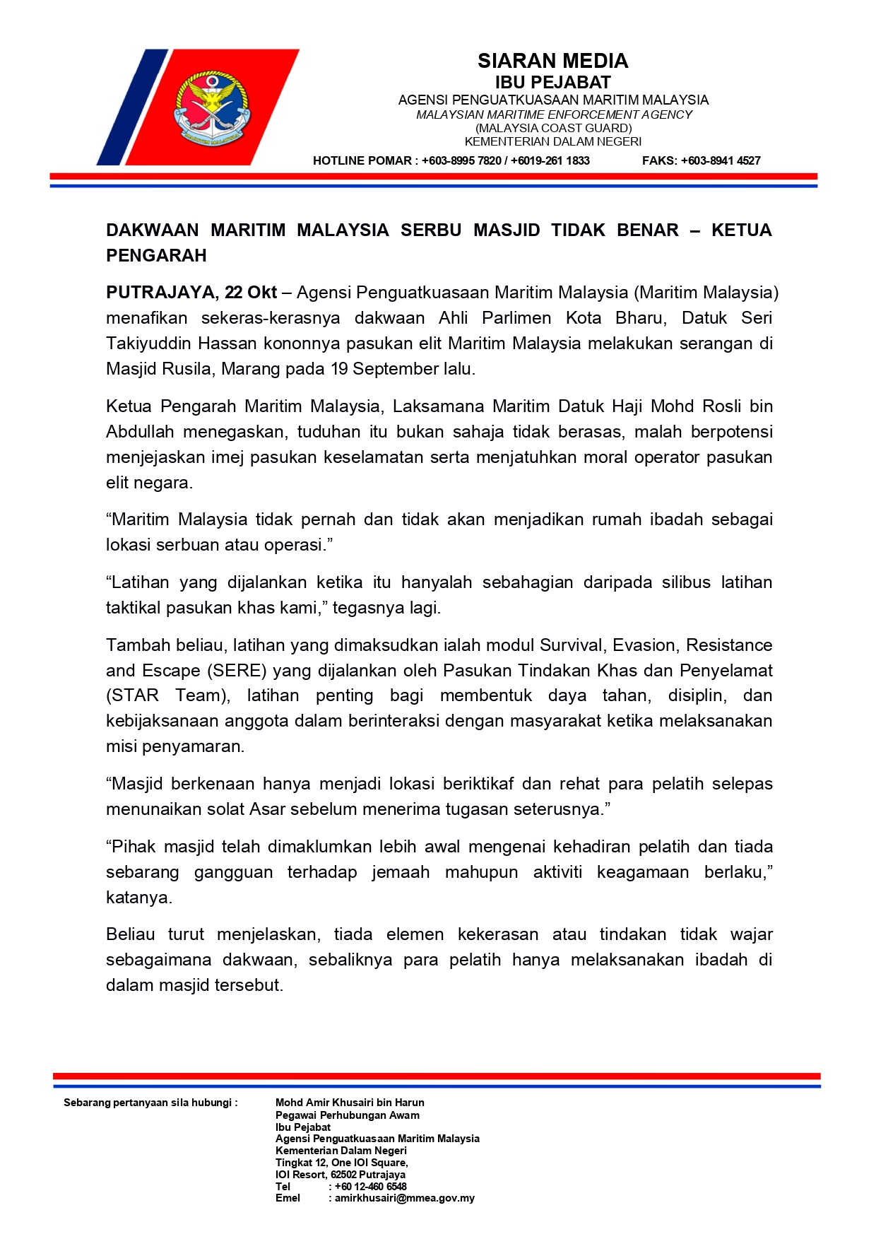 gensi Penguatkuasaan Maritim Malaysia (APMM) menafikan sekeras-kerasnya dakwaan kononnya pasukan elit mereka melakukan serbuan di Masjid Rusila, Marang, pada 19 September lalu antara jam 5 hingga 6 petang.
