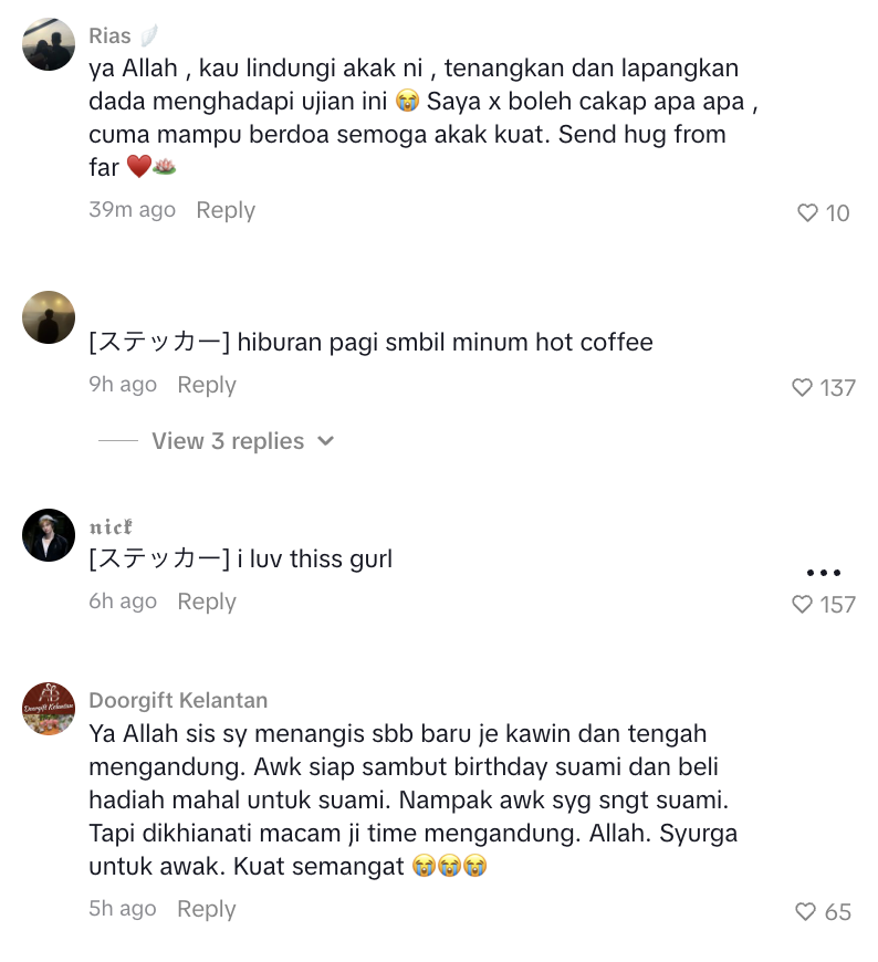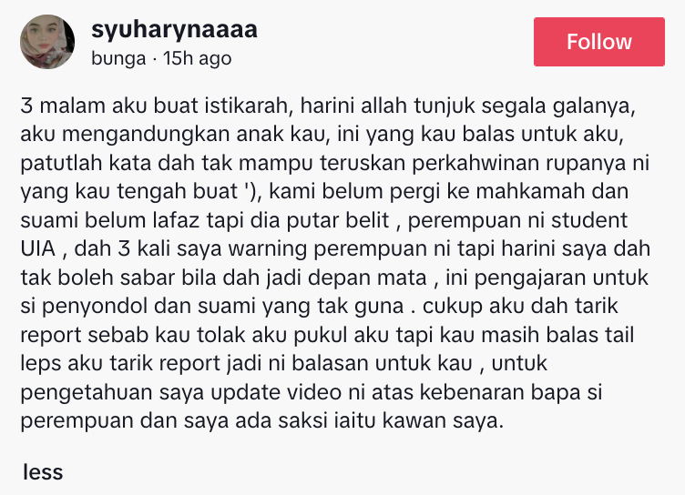 Dalam perkongsian pertama sewaktu menemui suaminya, wanita dipercayai sedang hamil menyatakan sudah membuat solat sunat istikharah untuk mencari petunjuk berkenaan hubungan ‘gelap’ suaminya dengan perempuan lain.