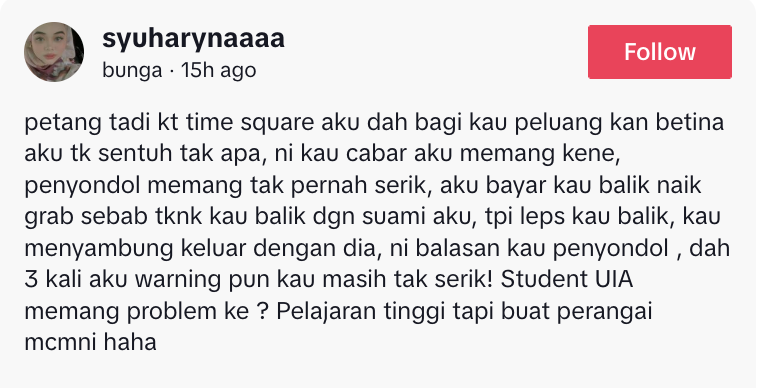 Tambah wanita berkenaan, dia sudah memaklumkan dan memberi amaran kepada perempuan yang dekat dengan suaminya bahawa mereka adalah suami isteri.