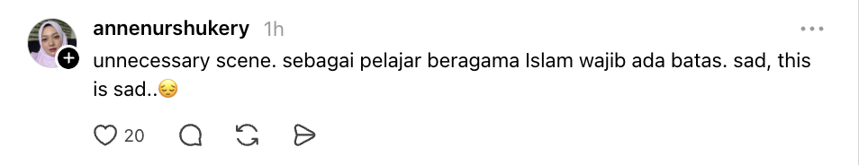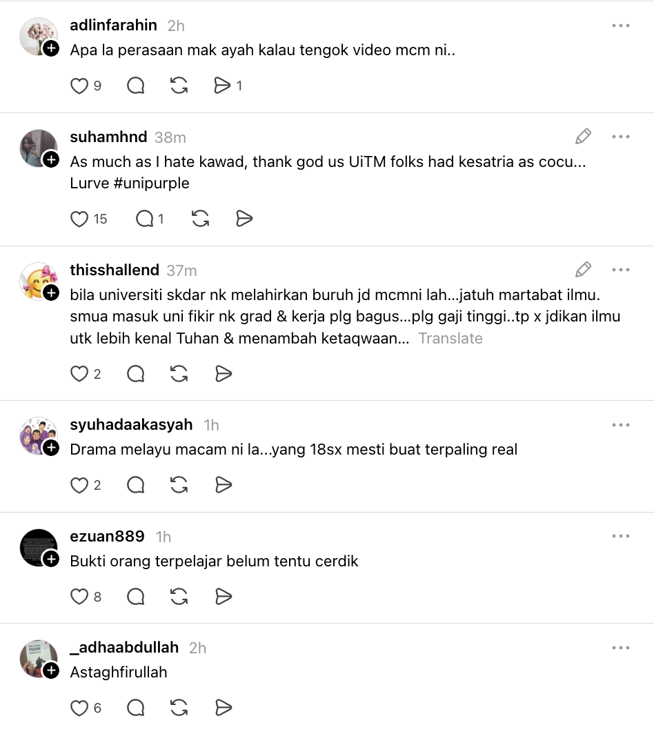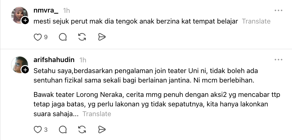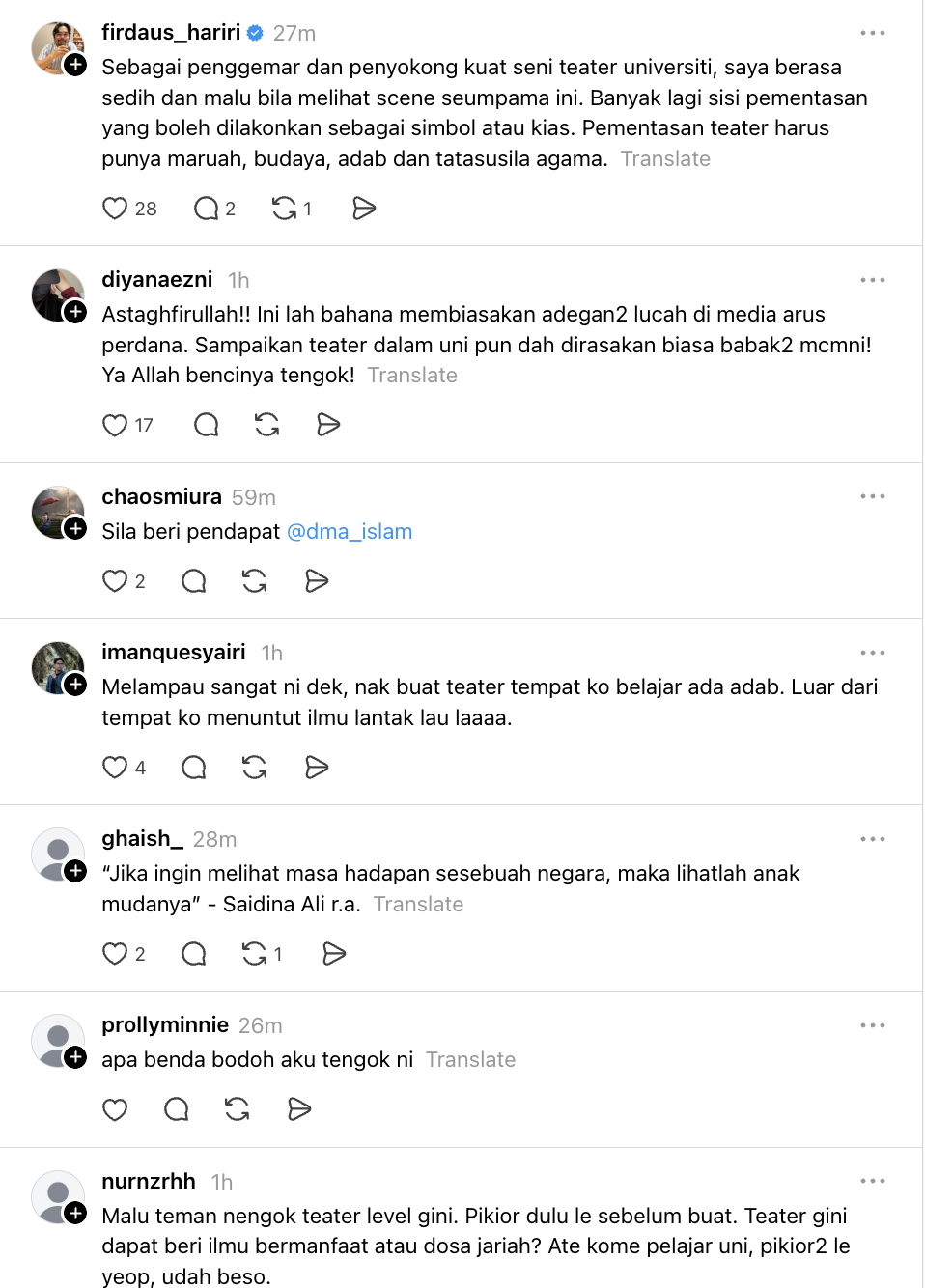 Meninjau di ruangan komen, rata-rata warganet turut meluahkan rasa terkilan melihat adengan tersebut disertakan dalam pementasan teater daripada pelajar universiti.