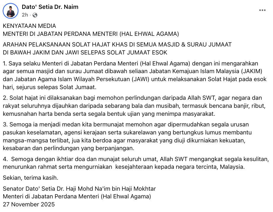 Ribut Tropika Senyar: Masjid & Surau Bawah Seliaan JAKIM Diarah Buat Solat Hajat
