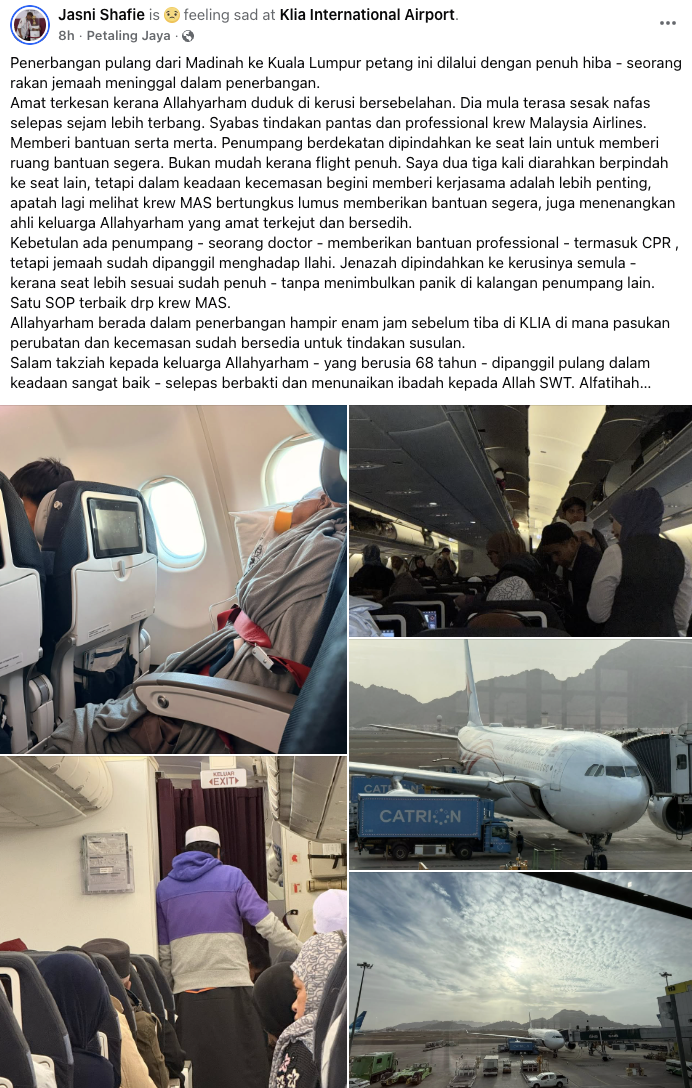 “Penerbangan pulang dari Madinah ke Kuala Lumpur petang ini (waktu semasa) dilalui dengan penuh hiba – seorang rakan jemaah meninggal dalam penerbangan.