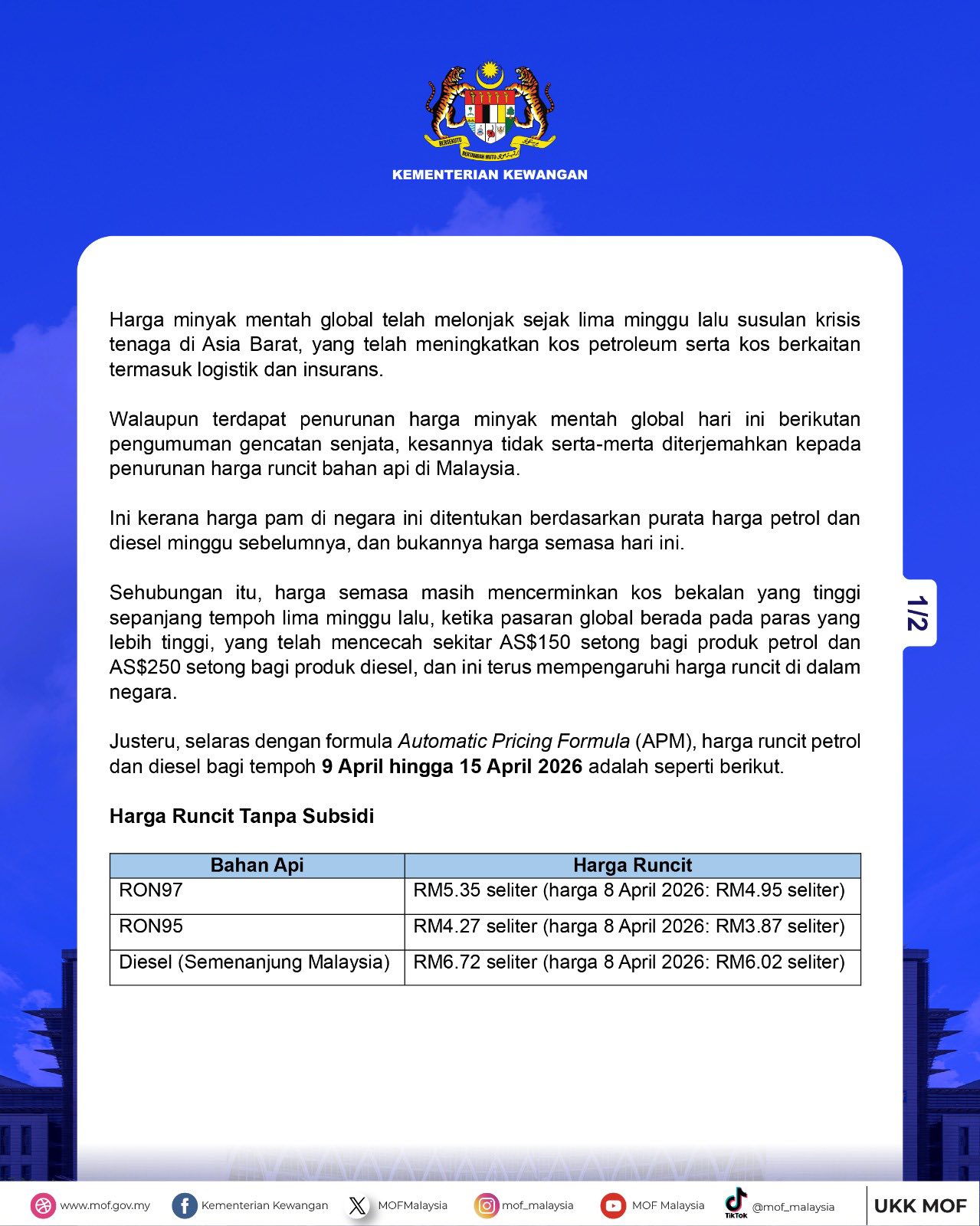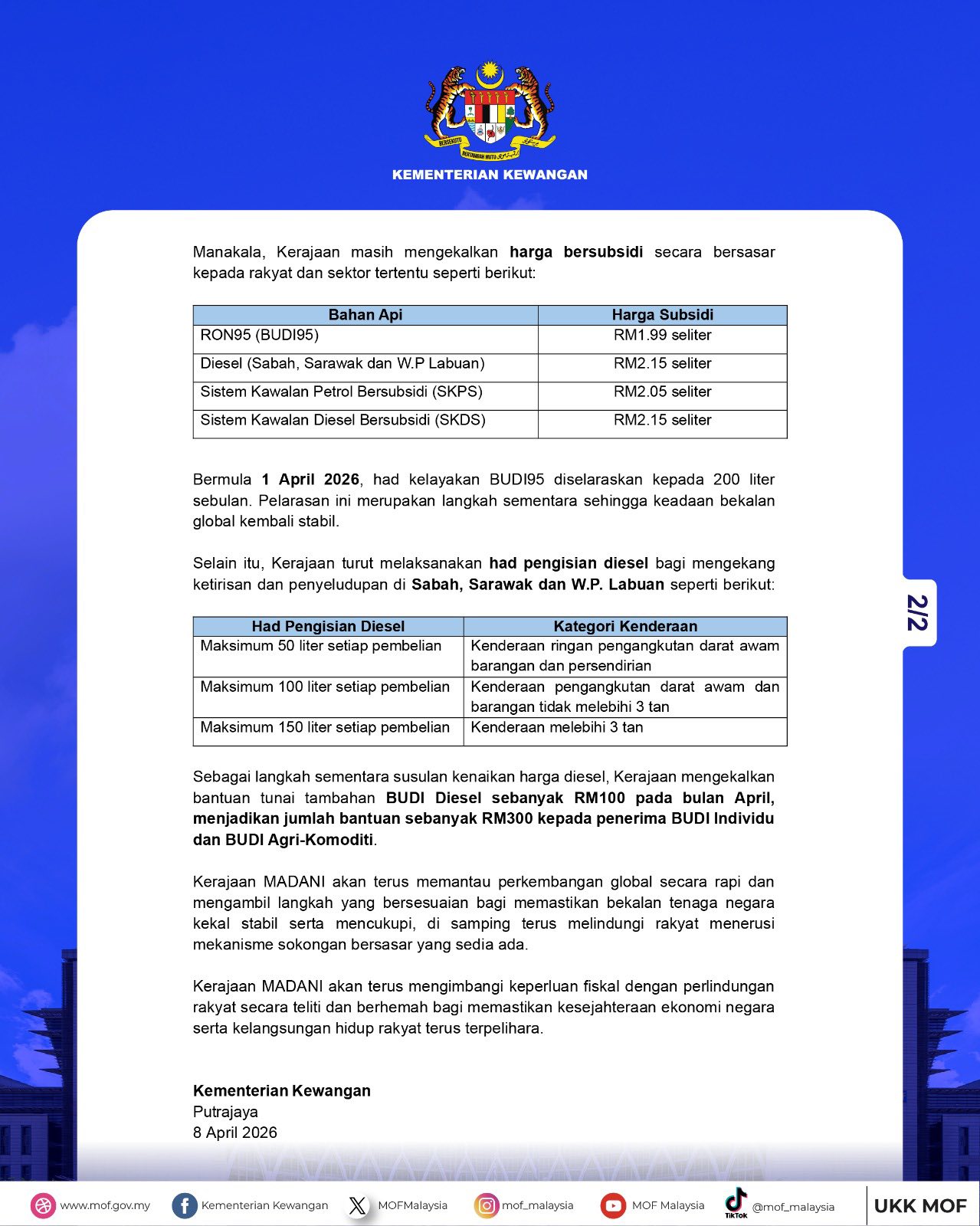 Artikel lain: Harga Minyak Global Melonjak, Kerajaan Terus Kekal Subsidi Demi Lindungi Rakyat – MoF