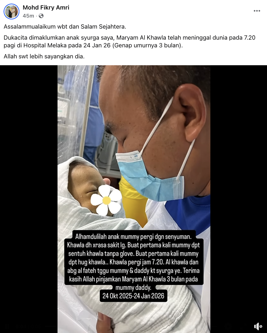 “Dukacita dimaklumkan anak syurga saya, Maryam Al Khawla telah meninggal dunia pada 7.20 pagi di Hospital Melaka pada 24 Jannuari 2026 (Genap umurnya 3 bulan),” ujarnya.