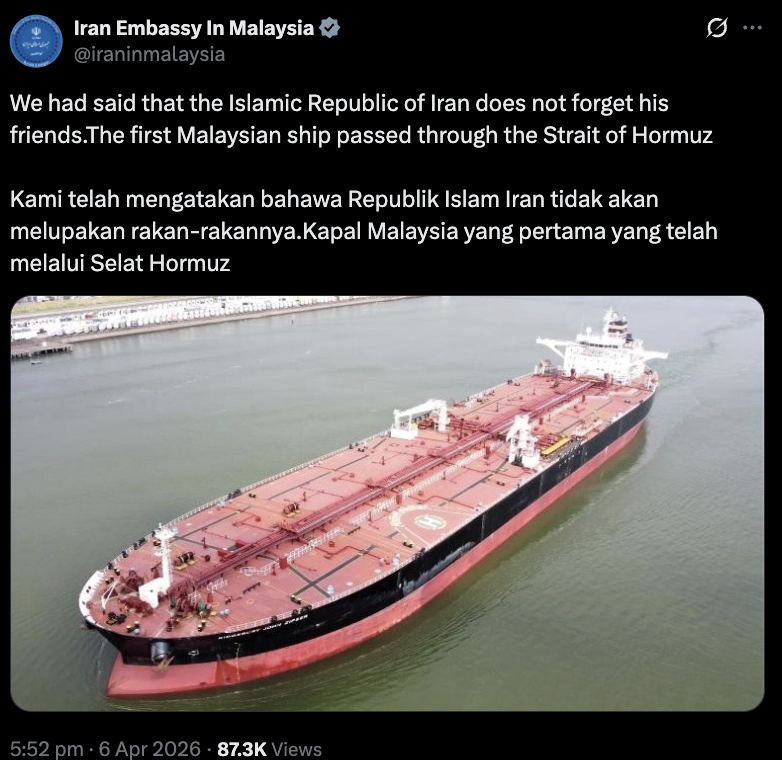 Sebuah kapal Malaysia dilaporkan berjaya melepasi Selat Hormuz, menurut kenyataan Kedutaan Iran sekali gus memberi kelegaan dalam situasi tegang di laluan penting itu.