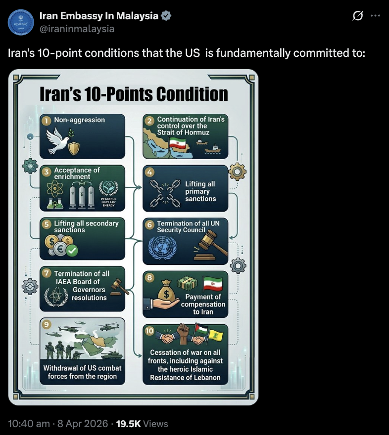 Antara syarat lain termasuk tiada lagi serangan ke atas Iran, pengiktirafan kawalan Teheran ke atas Selat Hormuz, serta penerimaan terhadap program pengayaan nuklear negara itu.