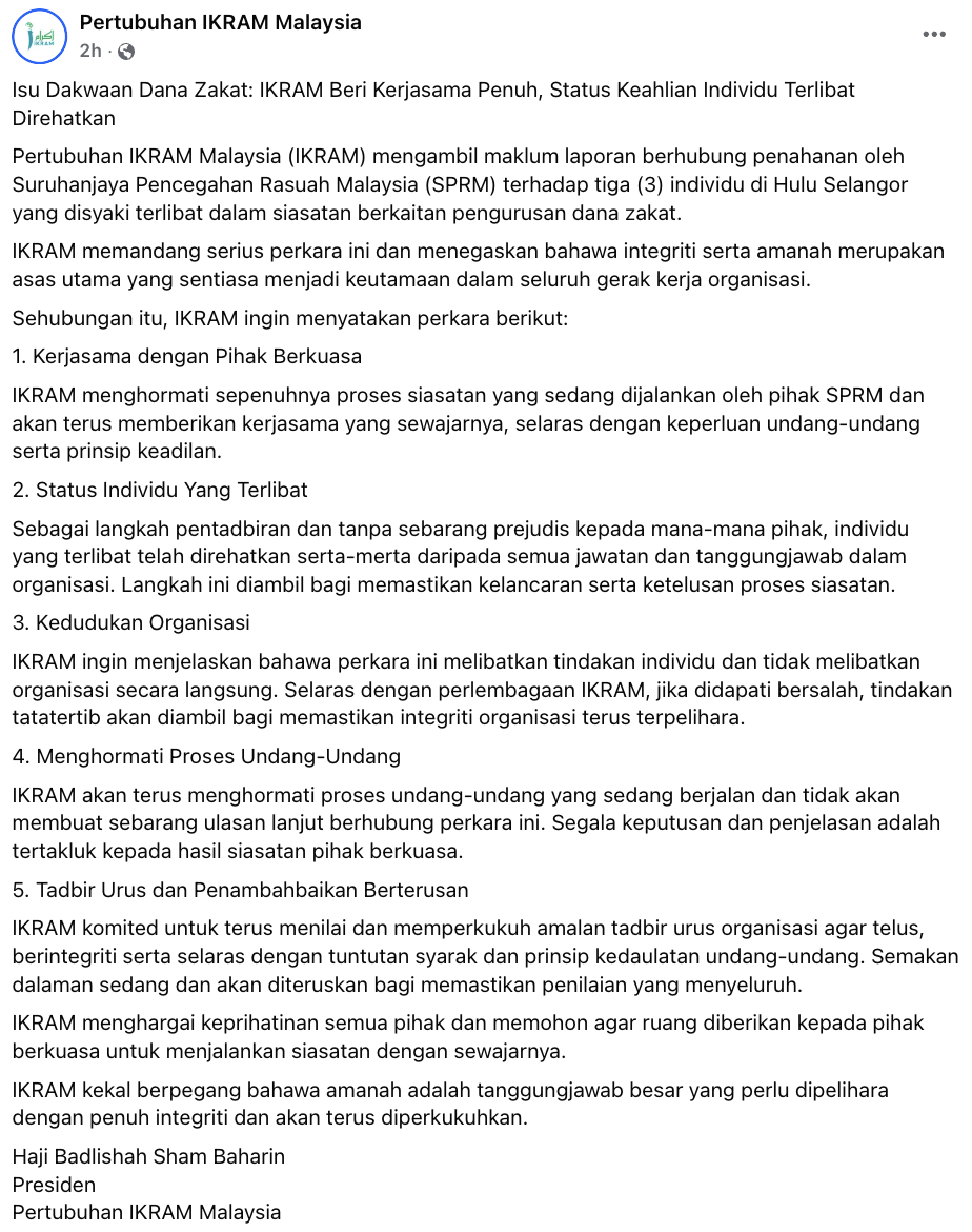 Isu Skandal Dana Zakat: 3 Ahli Ditahan SPRM, Ikram Malaysia Janji Beri Kerjsama Penuh