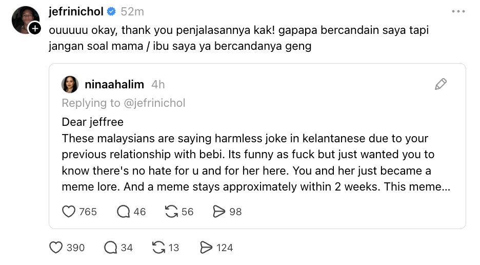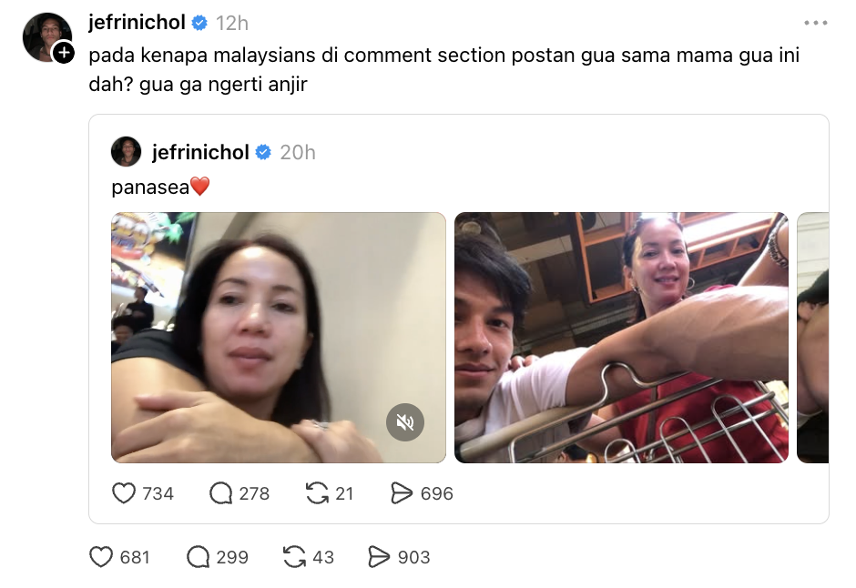Sebelum itu, Jefri turut mempersoalkan tindakan netizen Malaysia yang ‘berkumpul’ dalam satu hantaran lain ketika dia berkongsi video dan foto bersama ibunya.