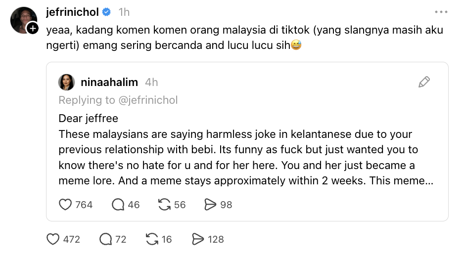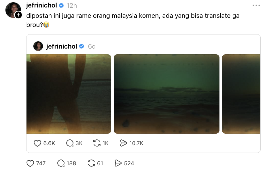 Aktor Indonesia, Jefri Nichol mencuri perhatian apabila meluahkan rasa pelik selepas hantaran media sosialnya dibanjiri komen dalam dialek Kelantan daripada netizen Malaysia.