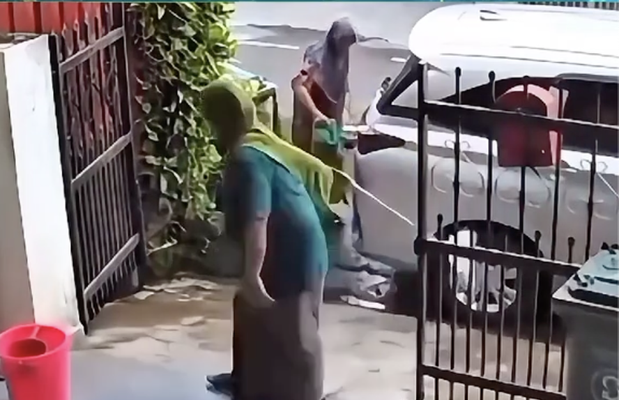 Terdahulu tular satu rakaman video seorang wanita telah menghalakan blower ke arah jirannya sebelum berlaku simbah menyimbah air antara mereka.