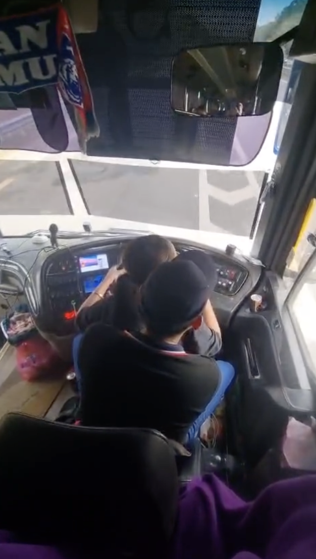 Terdahulu, tukar rakaman menunjukkan seorang wanita duduk di atas riba pemandu sambil memegang stereng ketika bas sedang bergerak.