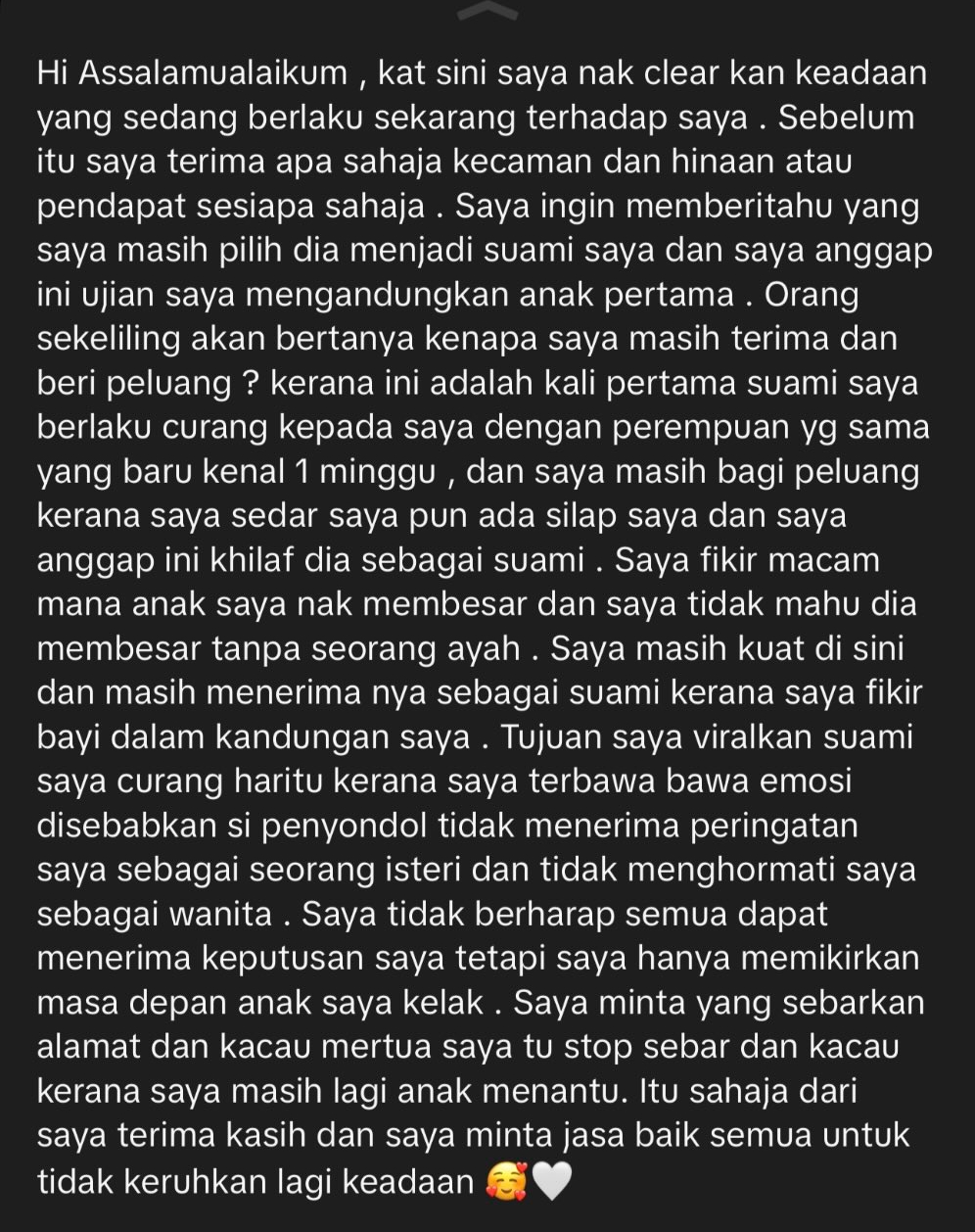 Menerusi hantaran yang dikongsi wanita terbabit, dia menyatakan masih memilih lelaki tersebut sebagai suaminya dan menganggap apa yang berlaku sebagai ujian ketika mengandung.