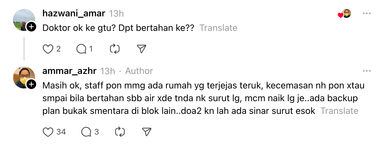 Ammar turut memaklumkan bahawa pegawai perubatan dan staf berada dalam keadaan baik, walaupun sebahagian daripada mereka turut terjejas akibat bencana itu.