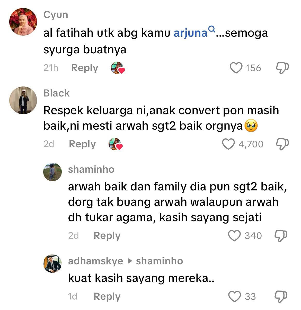 Malah ada juga yang memuji arwah merupakan seorang anak yang baik kerana keluarga masih bersamanya biarpun membuat keputusan untuk memeluk Islam.