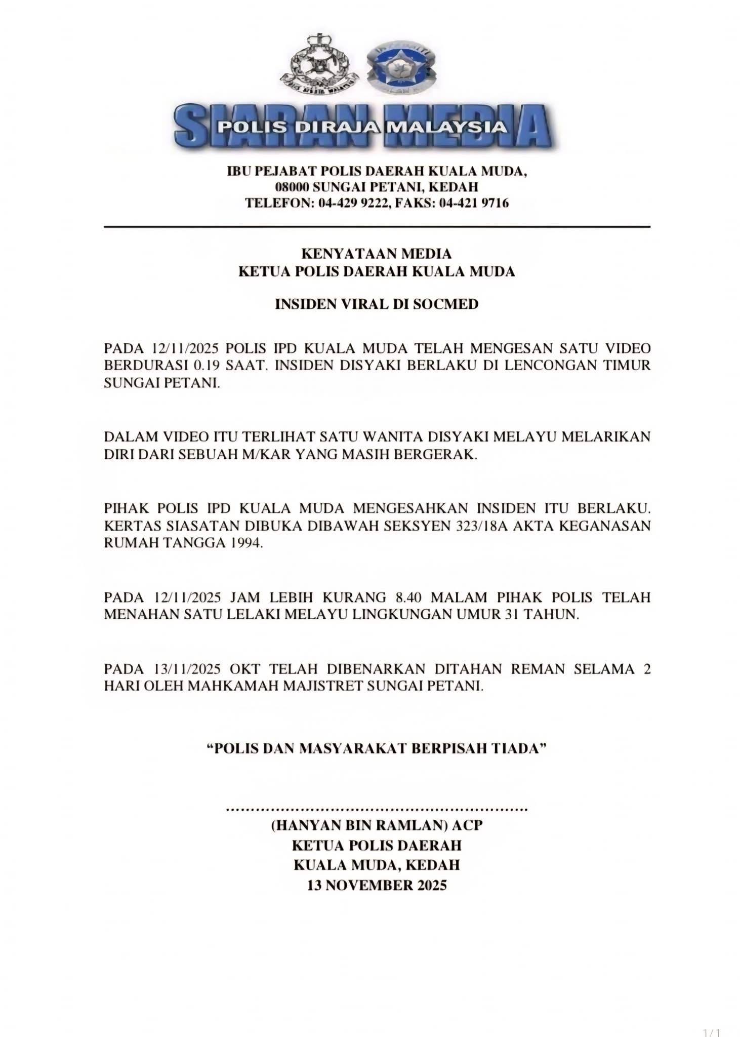 “Pihak polis daripada Ibu Pejabat Polis Daerah (IPD) Kuala Muda mengesahkan insiden tersebut benar-benar berlaku,” katanya dalam kenyataan.