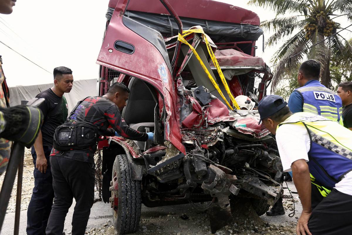Manakala lori ‘tipper’ dengan nombor pendaftaran AKL4674 datang dari arah bertentangan menuju ke Teluk Intan sebelum memasuki laluan bertentangan dan bertembung dengan lori FRU.