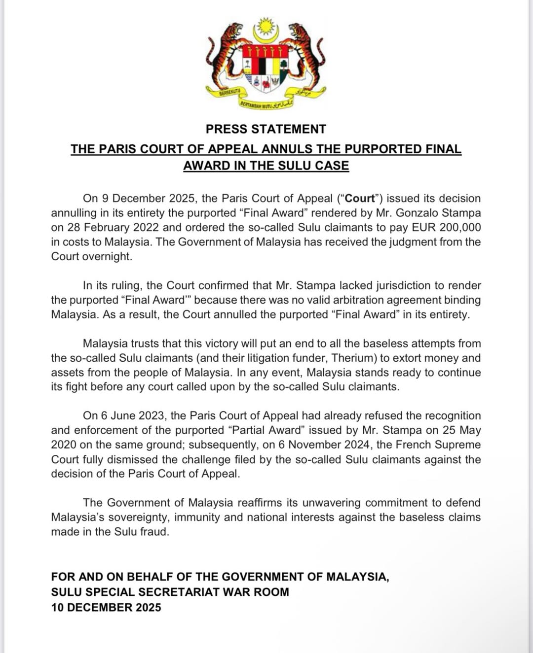Malaysia meraih kemenangan besar apabila Mahkamah Rayuan Paris pada 9 Disember lalu membatalkan sepenuhnya Award Akhir dalam tuntutan pihak yang mendakwa sebagai waris Kesultanan Sulu terhadap Sabah.