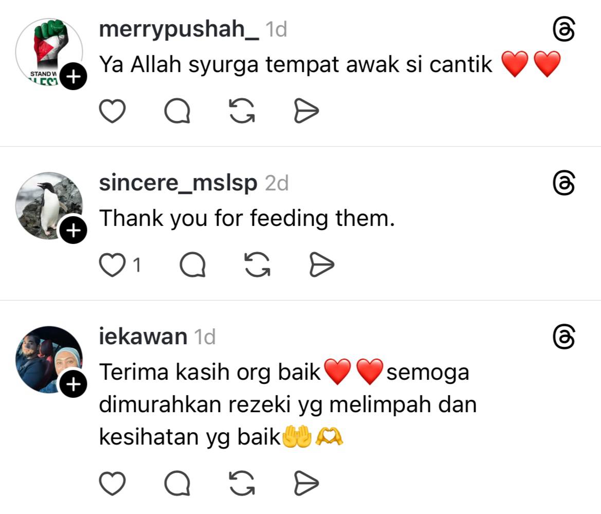Meninjau ke ruangan komen, warganet memuji tindakan mulia yang dilakukan oleh wanita itu kerana tidak ramai yang sanggup membelanjakan sejumlah wang demi memberi makan haiwan liar di jalanan.