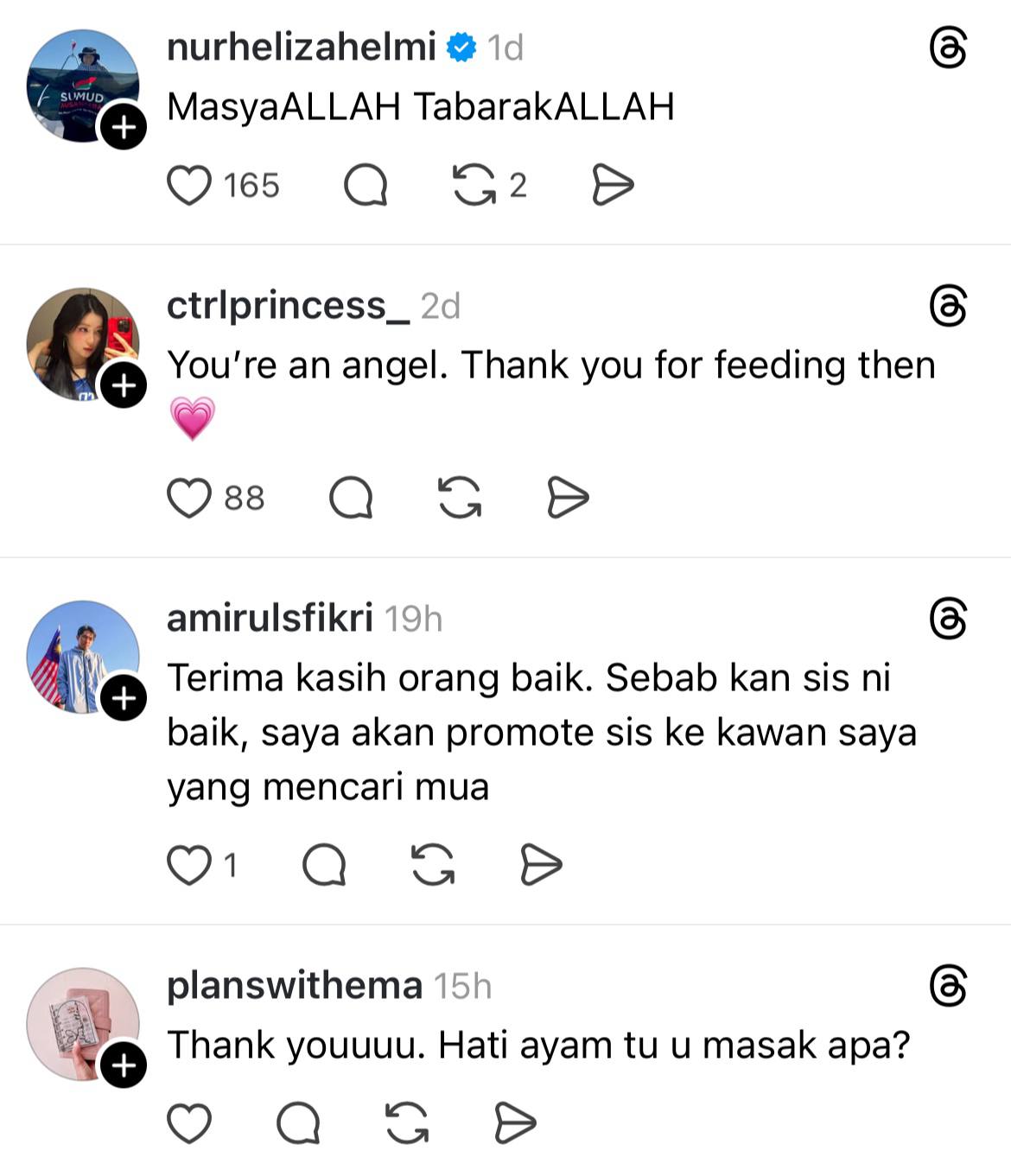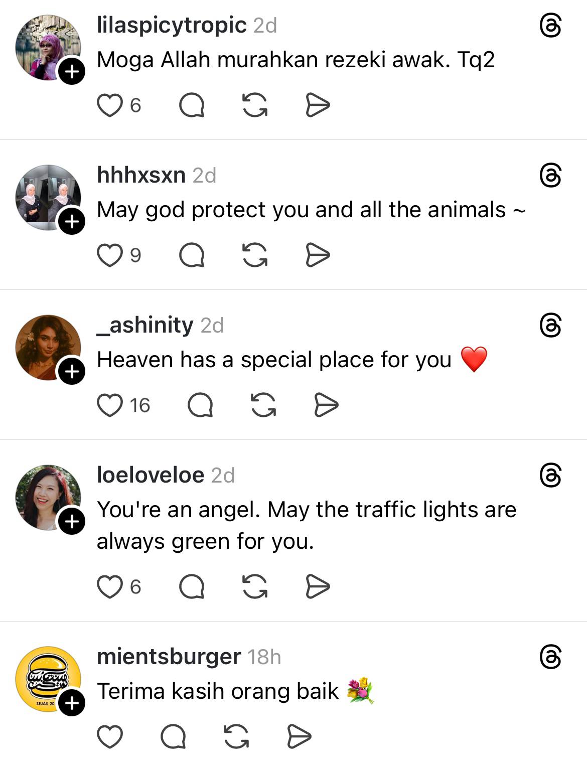 Malah ada juga wargamaya mengucapkan terima kasih dan mendoakannya agar sentiasa dimurahkan rezeki serta dipermudahkan segala urusan.