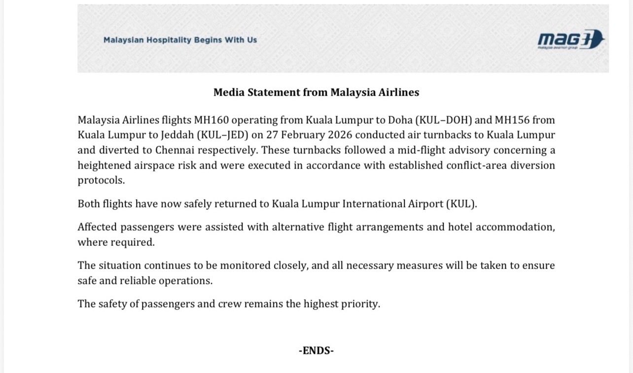 Syarikat penerbangan itu memaklumkan, penerbangan MH160 dari Kuala Lumpur ke Doha (KUL-DOH) dan MH156 dari Kuala Lumpur ke Jeddah (KUL-JED) pada 27 Februari lalu telah berpatah balik ke Kuala Lumpur sebelum dilencongkan ke Chennai.