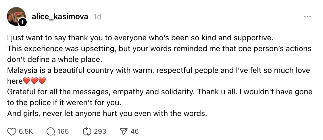 “Saya ingin mengucapkan terima kasih kepada semua yang telah begitu baik dan menyokong saya. Pengalaman ini memang menyedihkan, tetapi kata-kata anda semua mengingatkan saya bahawa tindakan seorang individu tidak mencerminkan keseluruhan tempat. Malaysia ialah negara yang indah dengan rakyat yang ramah dan penuh hormat, dan saya telah merasai begitu banyak kasih sayang di sini,” tulisnya.