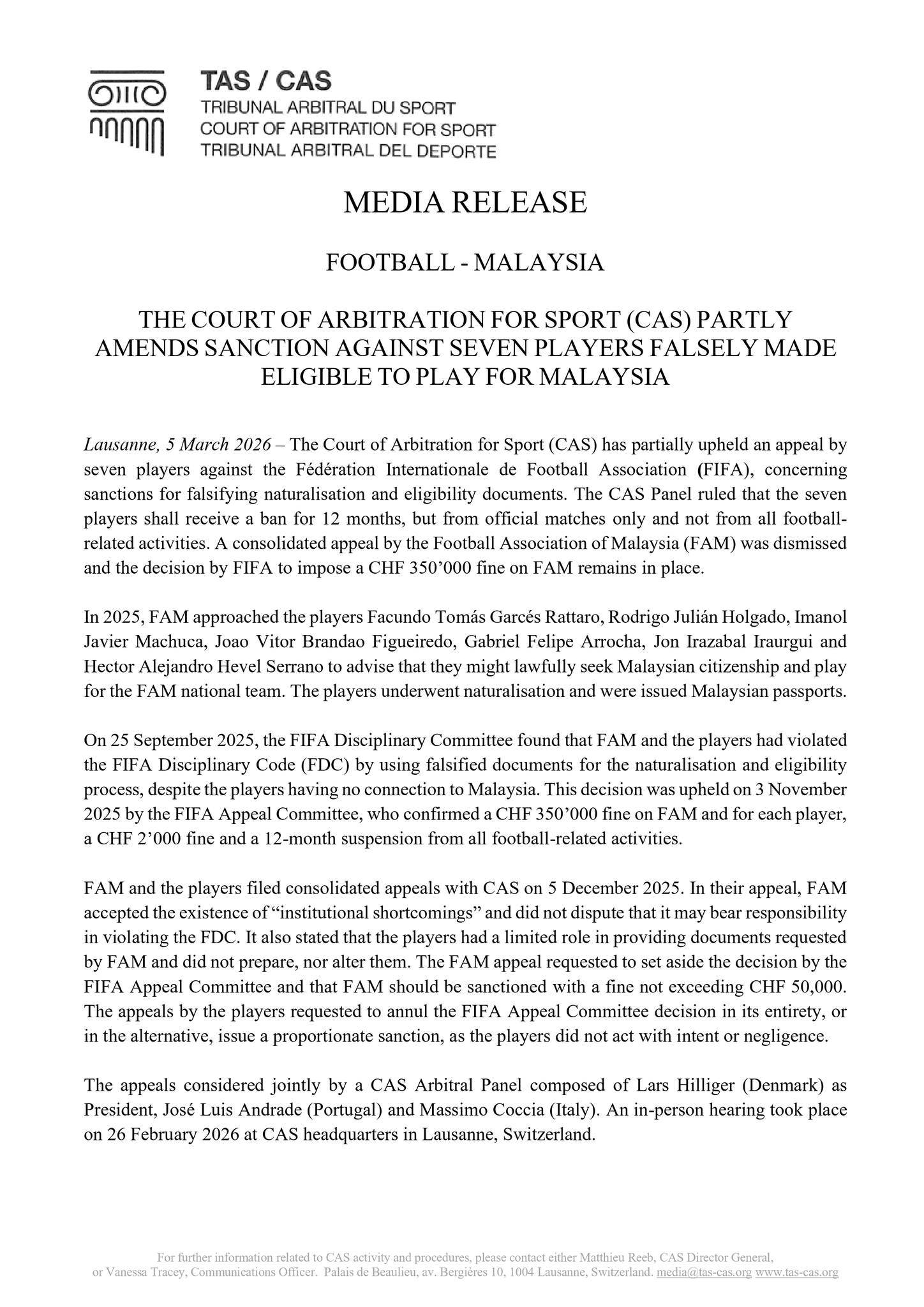 Dalam kenyataan sama, CAS turut mengesahkan rayuan yang dikemukakan secara bersama oleh Persatuan Bolasepak Malaysia (FAM) ditolak, sekali gus mengekalkan keputusan FIFA untuk mengenakan denda CHF 350,000 terhadap badan induk bola sepak negara itu.