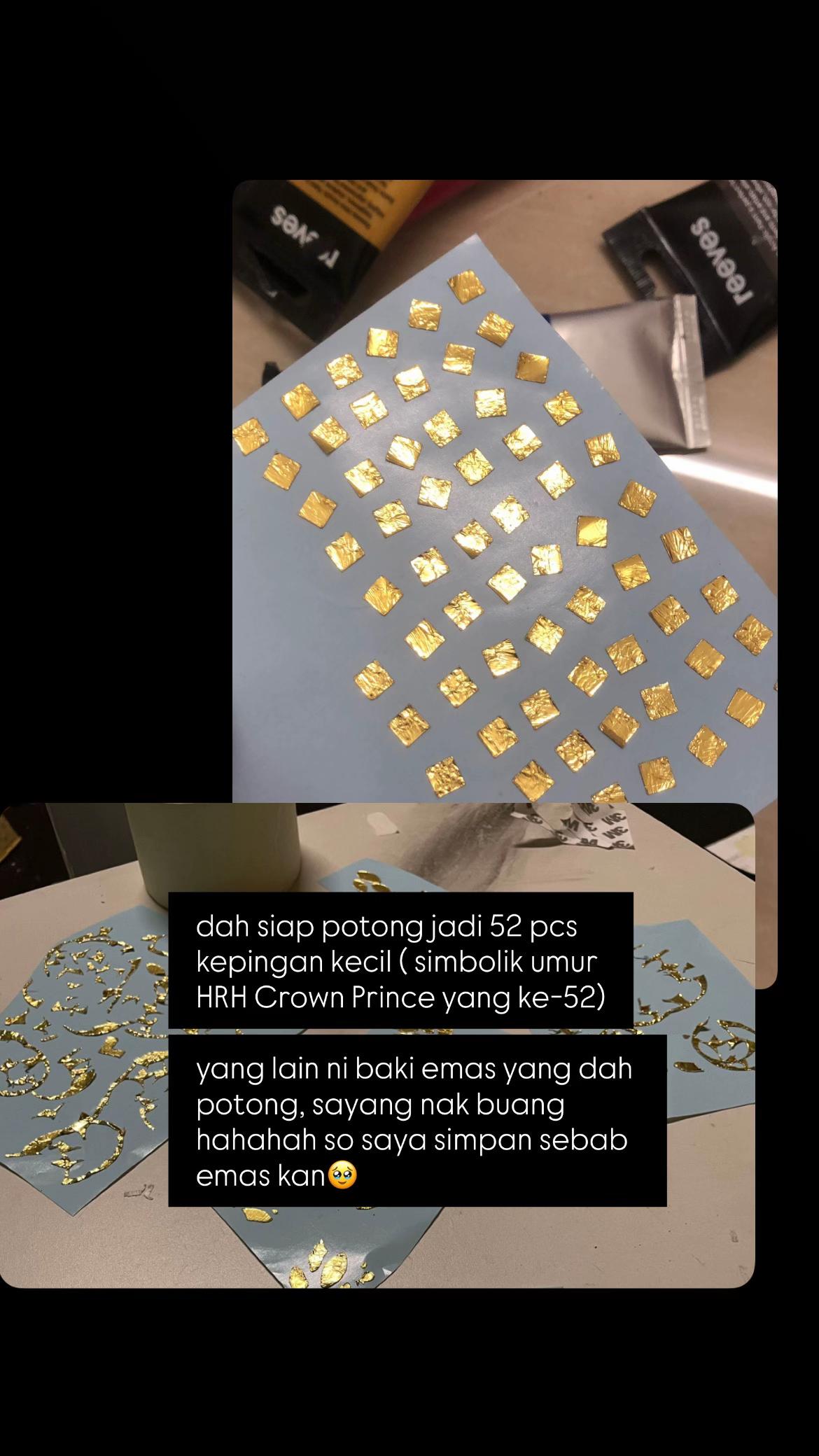 Menurutnya, kepingan emas dipotong kepada 52 bahagian kecil sebagai simbolik kepada usia Putera Mahkota.