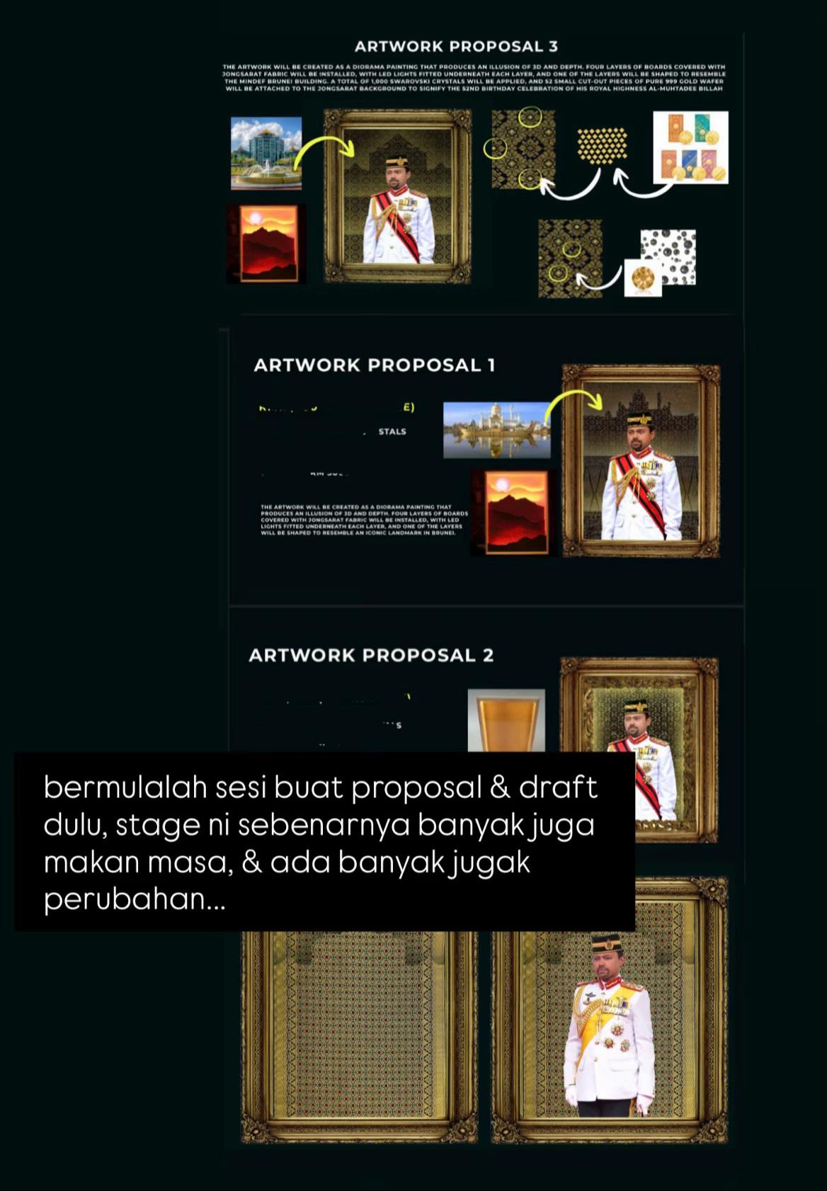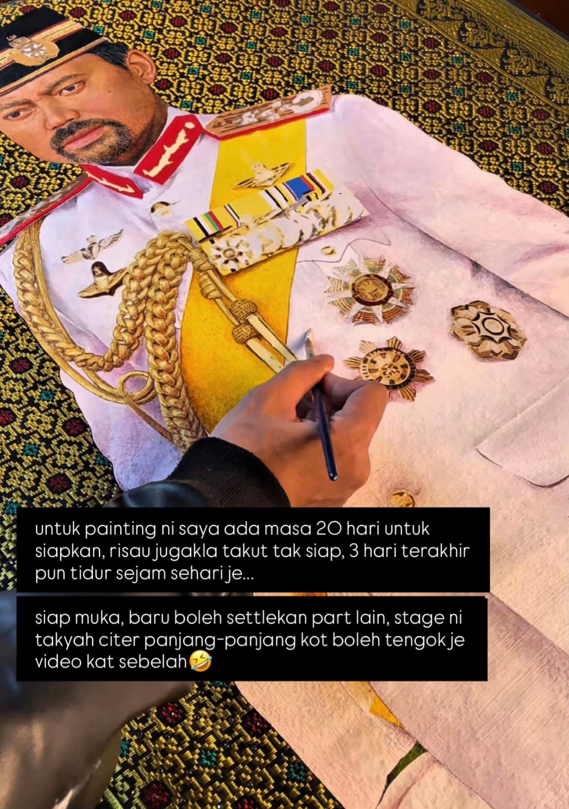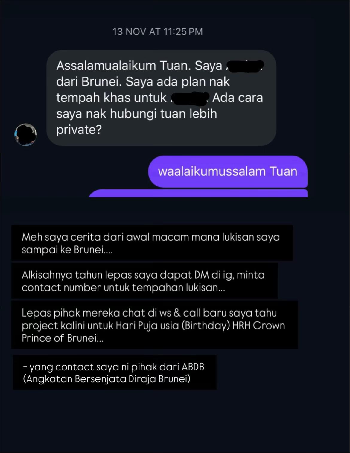 “Pada awalnya saya menerima mesej melalui Instagram dalam November tahun lepas daripada wakil Angkatan Bersenjata Diraja Brunei (ABDB) yang ingin menempah lukisan potret bertakhtakan emas dan batu Swarovski.