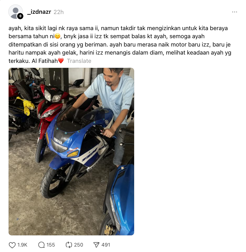 “Ayah baru saja merasa naik motor baru Izz, baru je hari tu nampak ayah gelak, harini Izz menangis dalam diam melihat keadaan ayah yang terkaku. Al-Fatihah,” tulisnya semalam.