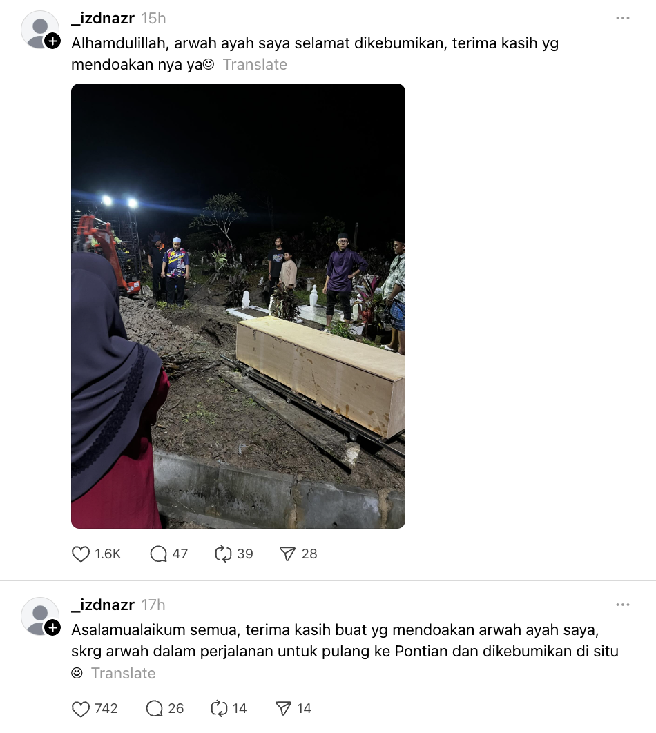 Sementara itu, Izzudin turut memaklumkan bahawa jenazah arwah bapanya selamat dikebumikan di Pontian Kechil malam tadi selain berterima kasih kepada semua yang mendoakan Allahyarham.