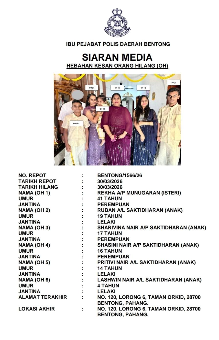 Menurut laporan Sinar Harian, Ketua Polis Daerah Bentong, Superintenden Zaiham Mohd Kahar berkata, wanita dikenali sebagai M Rekha, 41, bersama lima anaknya iaitu Ruban, 19; S Sharivina Nair, 17; S Shasini Nair, 16; S Pritivi Nair, 14; dan S Lashwin Nair, 4, ditemui berada di sekitar daerah Bentong.