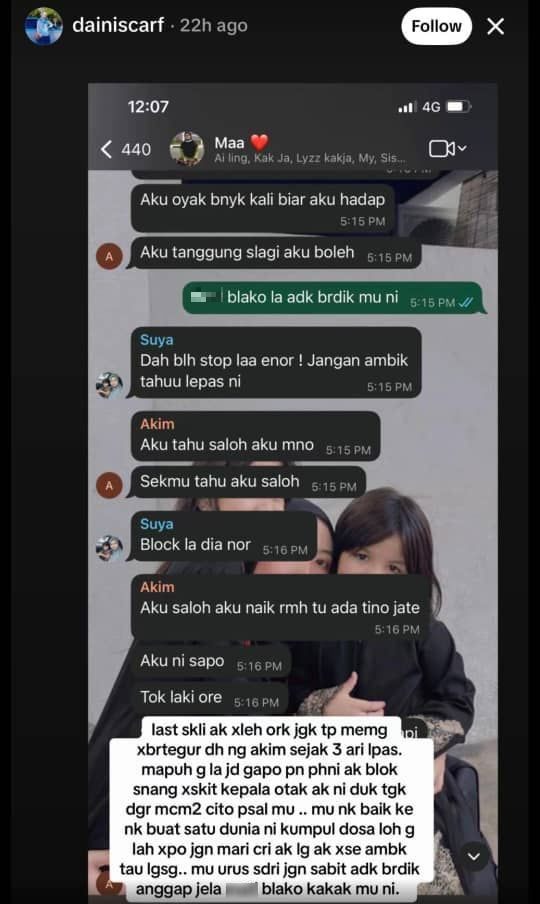 Perkara itu terbongkar selepas kakaknya, yang menggunakan nama @dainiscarf di TikTok, mendedahkan tangkap layar mesej perbualan tegang antara mereka di media sosial.