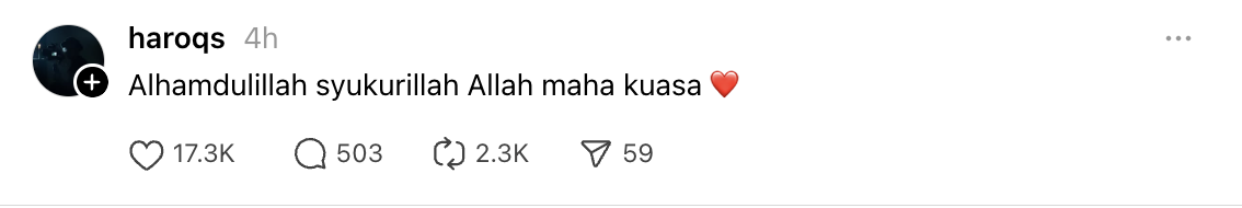 Dia turut berkongsi hantaran di Thread dengan meluahkan rasa syukur diatas semuanya dan merupakan ciapan pertamanya di platform tersebut.