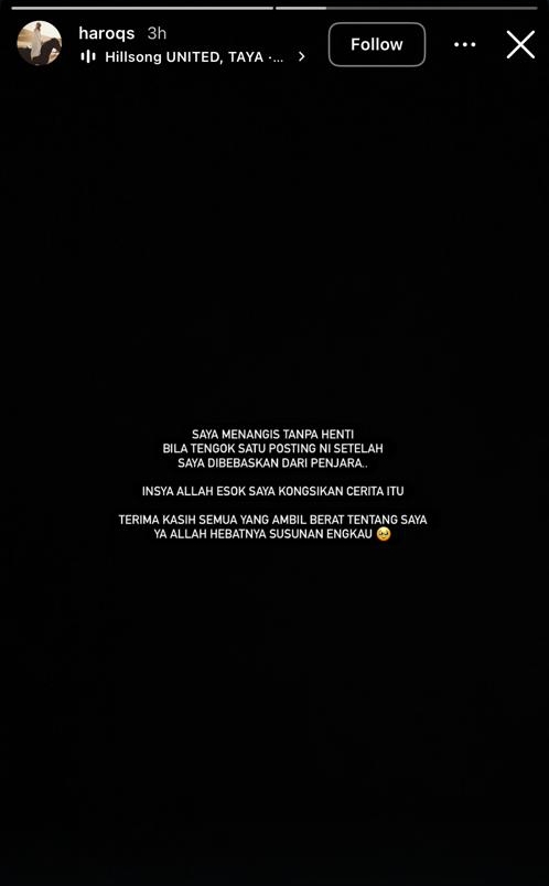 Menerusi hantaran di Insta Story, Haroqs yang baru sahaja dibebaskan daripada tahanan Zionis telah memuat naik perkongsian menyatakan rasa sebak melihat semua sokongan yang diberikan orang ramai terutamanya rakyat Malaysia.