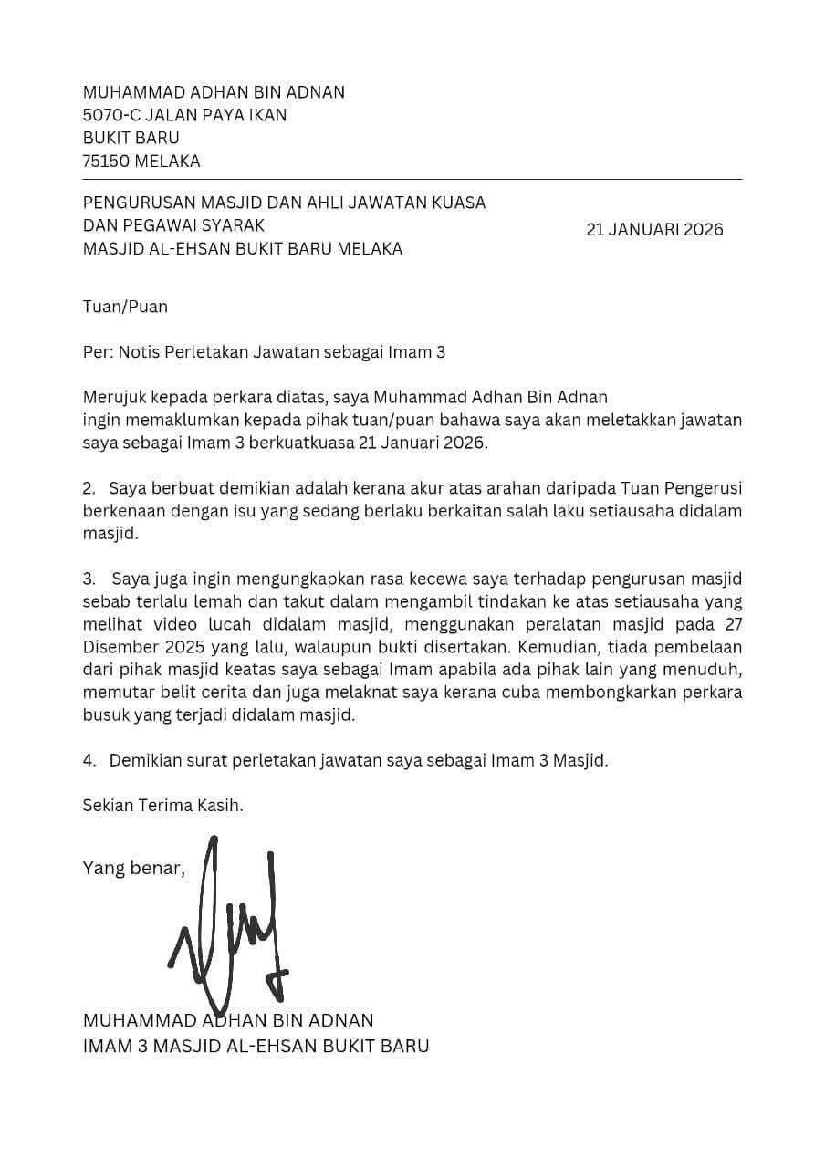 Dalam surat perletakan jawatan bertarikh 21 Januari 2026, beliau berkata keputusan itu dibuat selepas akur dengan arahan pengerusi masjid berhubung isu salah laku yang sedang berlaku.