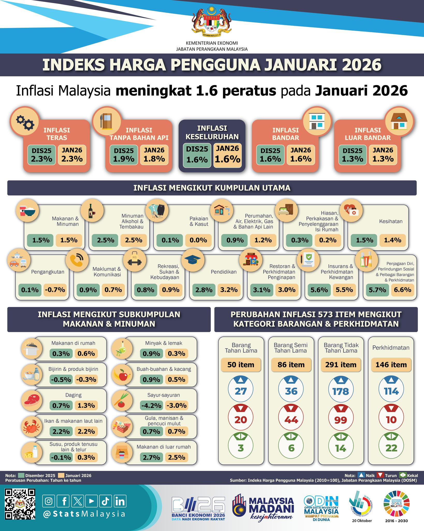 Inflasi Malaysia meningkat 1.6 peratus pada Januari 2026 dengan mata indeks naik kepada 135.7 berbanding 133.6 pada bulan sama tahun lalu, menurut Jabatan Perangkaan Malaysia (DOSM).