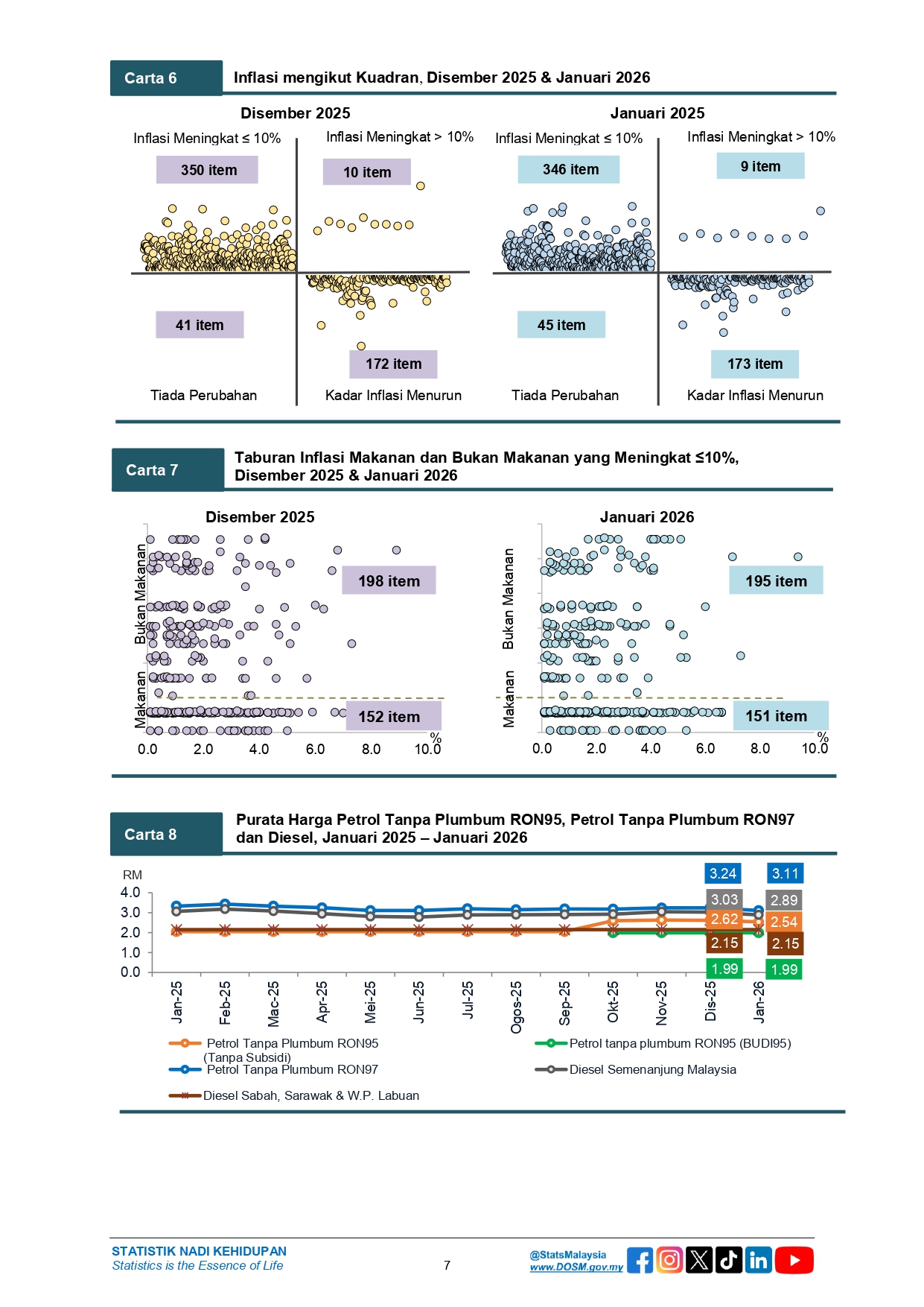 “Sementara itu, purata harga diesel di Semenanjung Malaysia adalah RM2.89 seliter berbanding RM3.03 seliter pada Disember 2025 (Januari 2025: RM3.06 seliter).