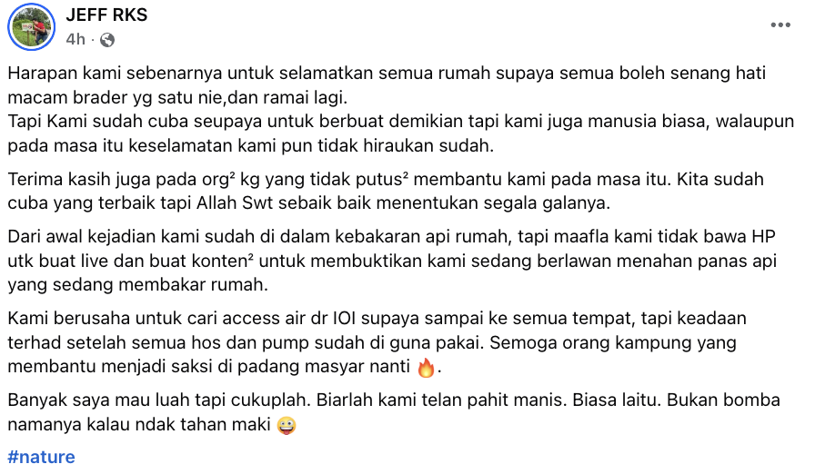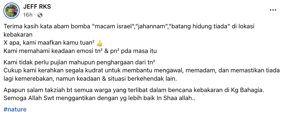Menerusi perkongsian daripada Jeff RKS, dia menyatakan mereka berdepan pelbagai cemuhan daripada segelintir individu di lokasi kejadian walaupun sedang bertungkus-lumus mengawal api dalam keadaan mencabar.