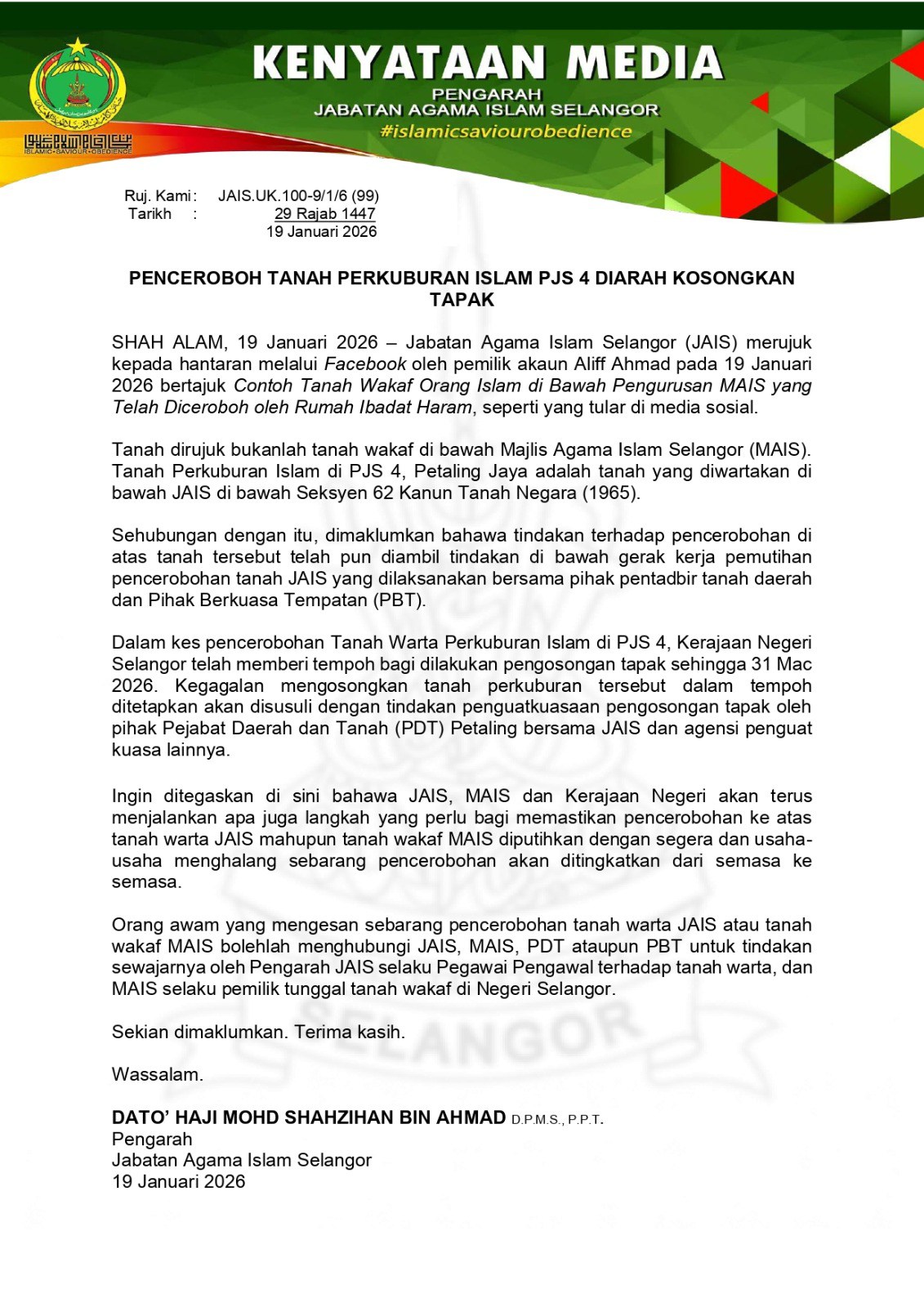 Beliau turut menegaskan bahawa tanah perkuburan berkenaan adalah tanah yang diwartakan di bawah JAIS mengikut Seksyen 62 Kanun Tanah Negara (1965), dan bukan tanah wakaf di bawah Majlis Agama Islam Selangor (MAIS) seperti yang ditularkan di media sosial.