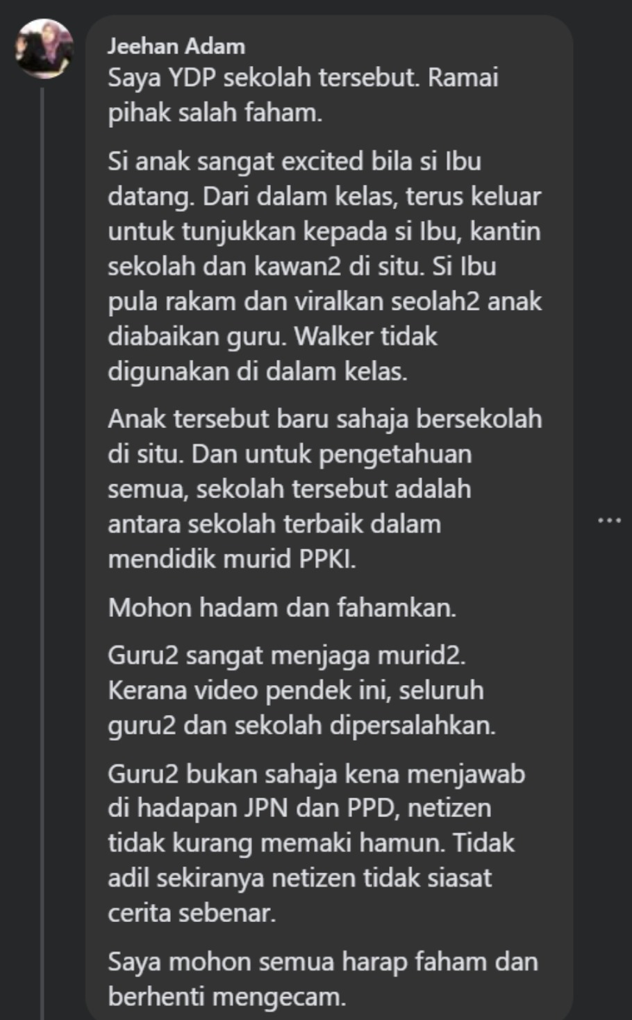“Murid berkenaan bukan ditinggalkan atau diabaikan. Dia keluar secara spontan untuk menunjukkan kepada ibunya kawasan sekolah termasuk kantin dan rakan-rakan,” jelas Jeehan.