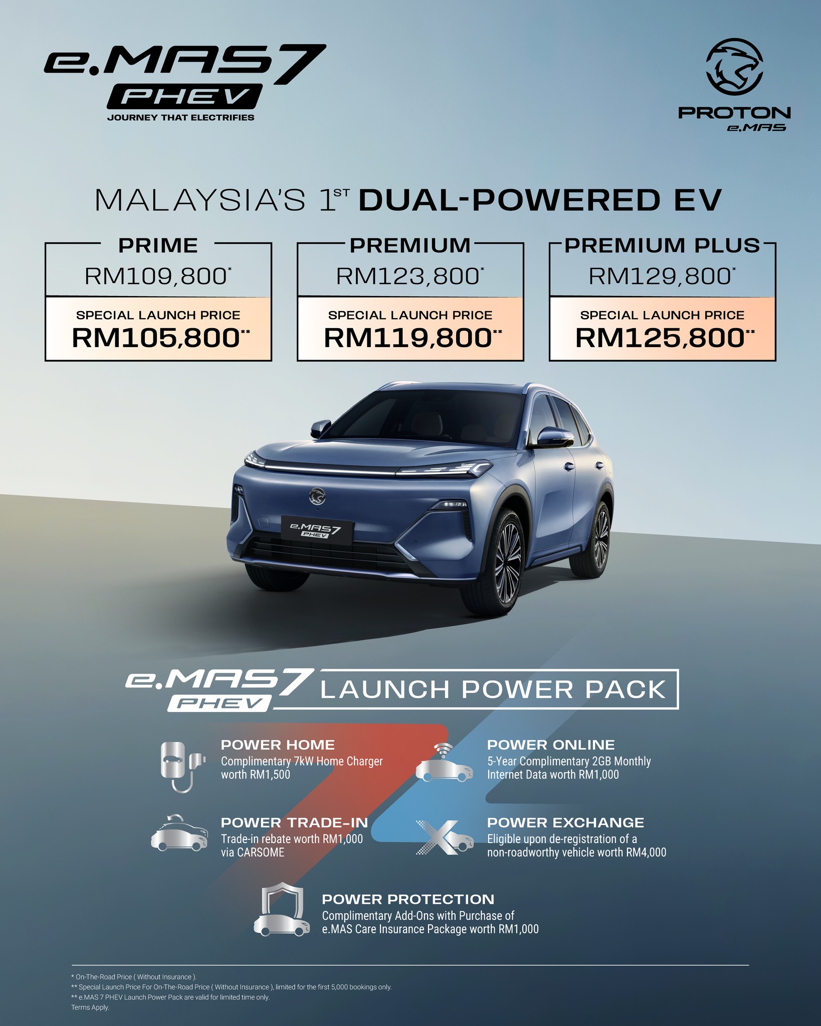 Proton e.MAS 7 PHEV hadir dalam tiga varian, iaitu Prime (RM109,800), Premium (RM123,800) dan Premium Plus (RM129,800), dengan perbezaan utama melibatkan kapasiti bateri, jarak pemanduan elektrik serta keupayaan pengecasan.