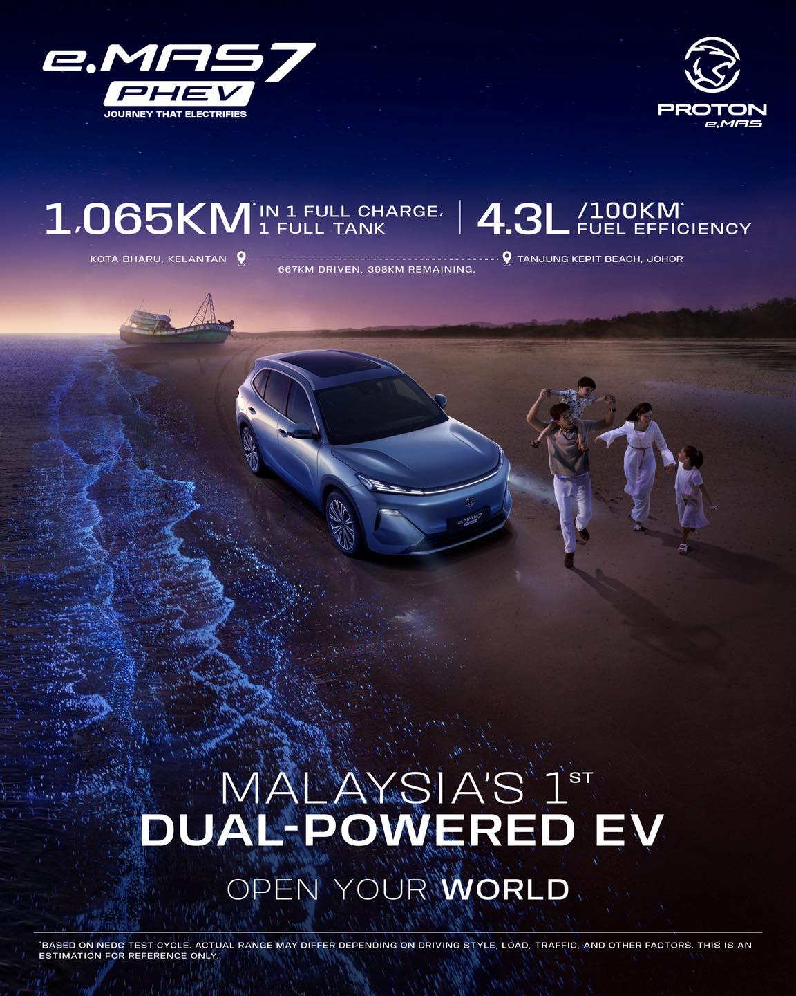 Gabungan enjin petrol dan motor elektrik membolehkan Proton e.MAS 7 PHEV mencapai jarak pemanduan keseluruhan sehingga 1,000 kilometer, manakala varian Premium Plus mampu mencecah sehingga 1,065 kilometer.