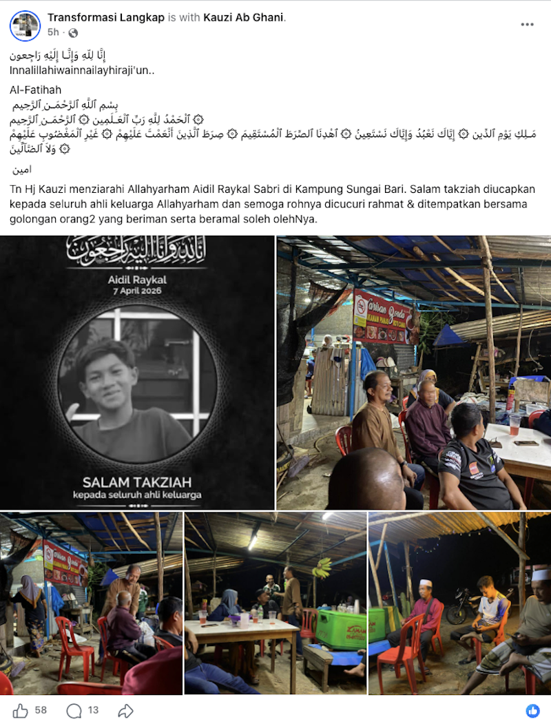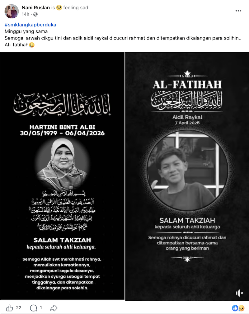 Sementara itu, beberapa warganet memuat naik hantaran di laman Facebook dipercayai memaparkan poster takziah kepada keluarga mangsa.