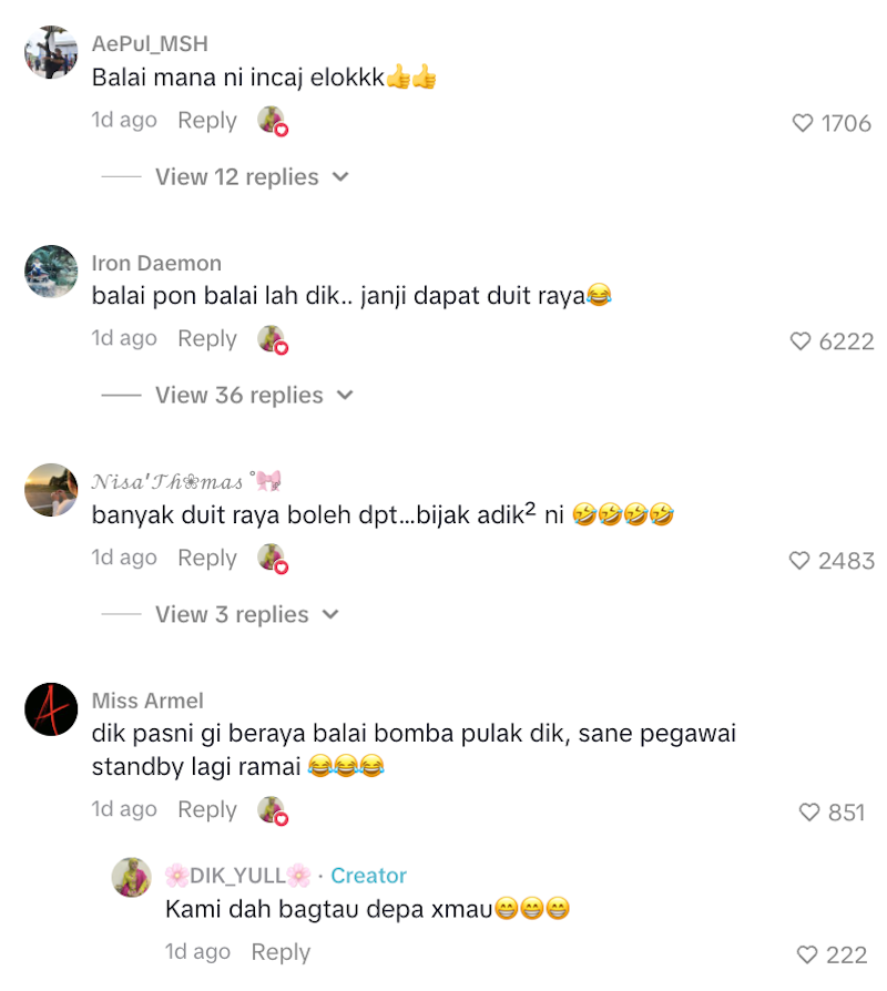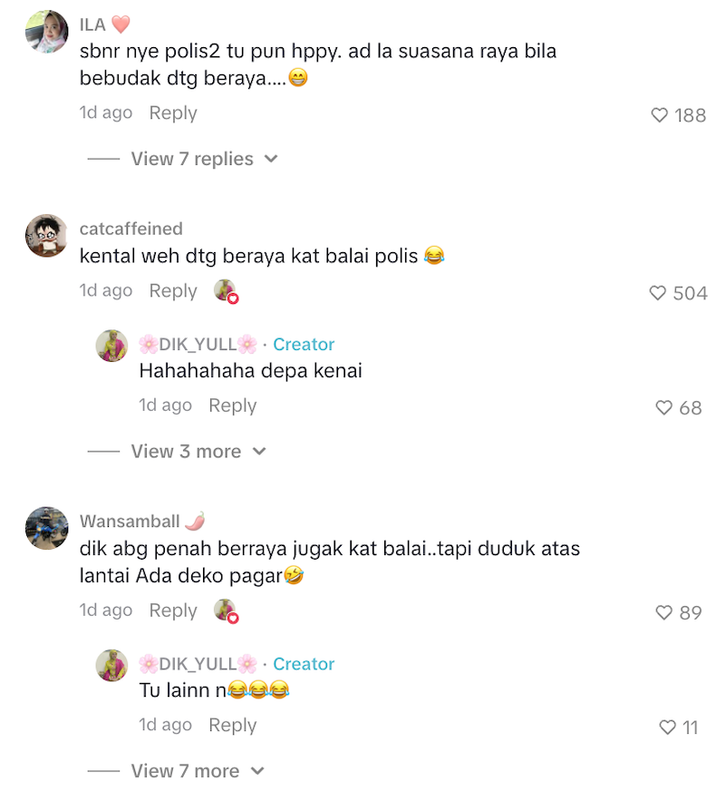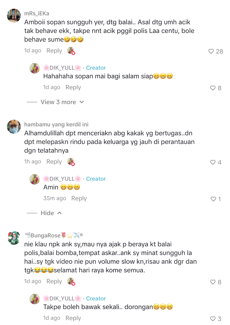 “Seumur hidup akak, pertama kali orang mai beraya di balai hahahahha. Siap bagi salam kami nak beraya,” tulisnya pada ruangan kapsyen video berkenaan.