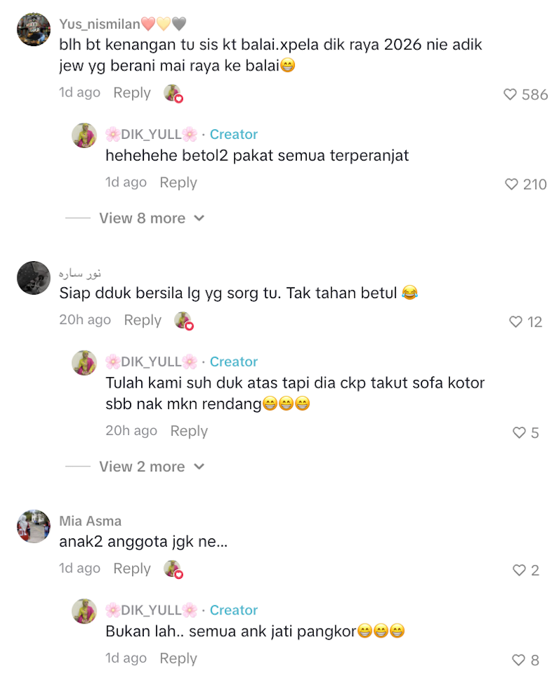 “Budak lain tak berani mai balai, depa elok mai beraya… Duk atas karpet takut sofa kotor katanya,” ujarnya lagi.