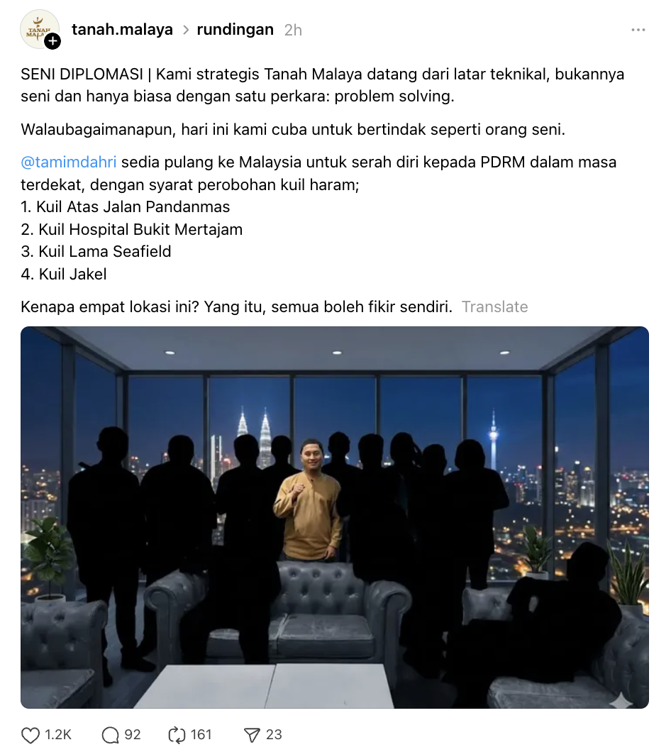 Perkara itu dinyatakan menerusi satu hantaran di platform Threads oleh akaun Tanah Malaya yang dipersetujui oleh Tamim sendiri.